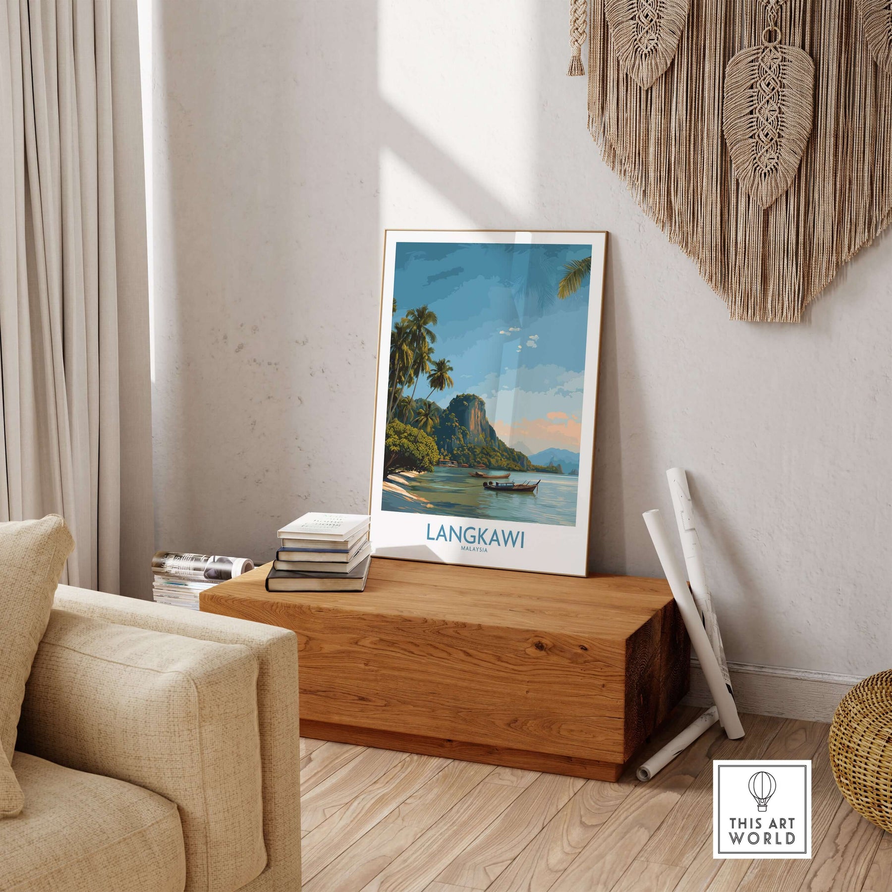 Langkawi Malaysia Tropical Beach Art Print | Longtail Boat Island Poster displayed in a cozy living space on wooden furniture.