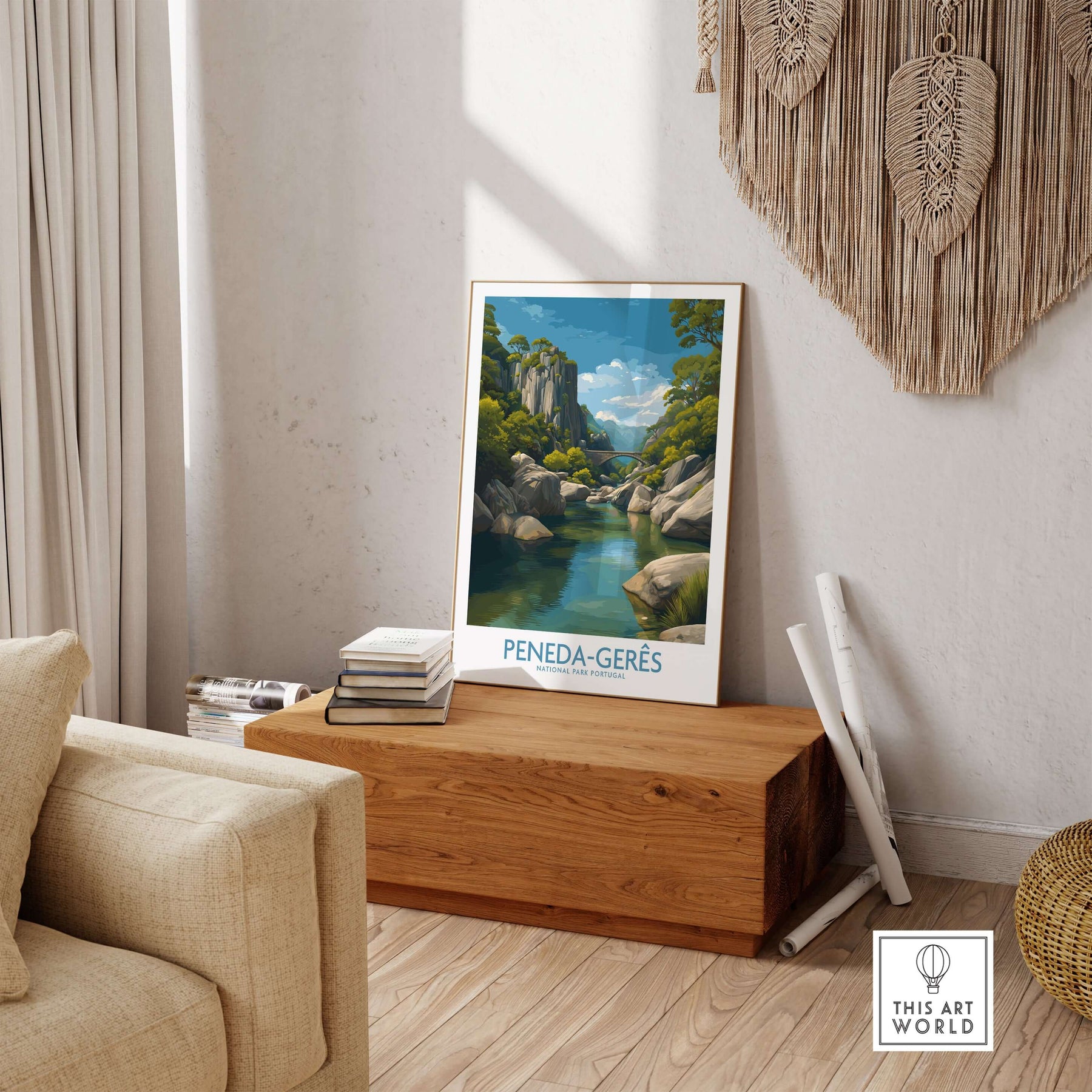 Peneda-Gerês Portugal Art Print | River Valley Landscape Poster displayed in a cozy living room setting.