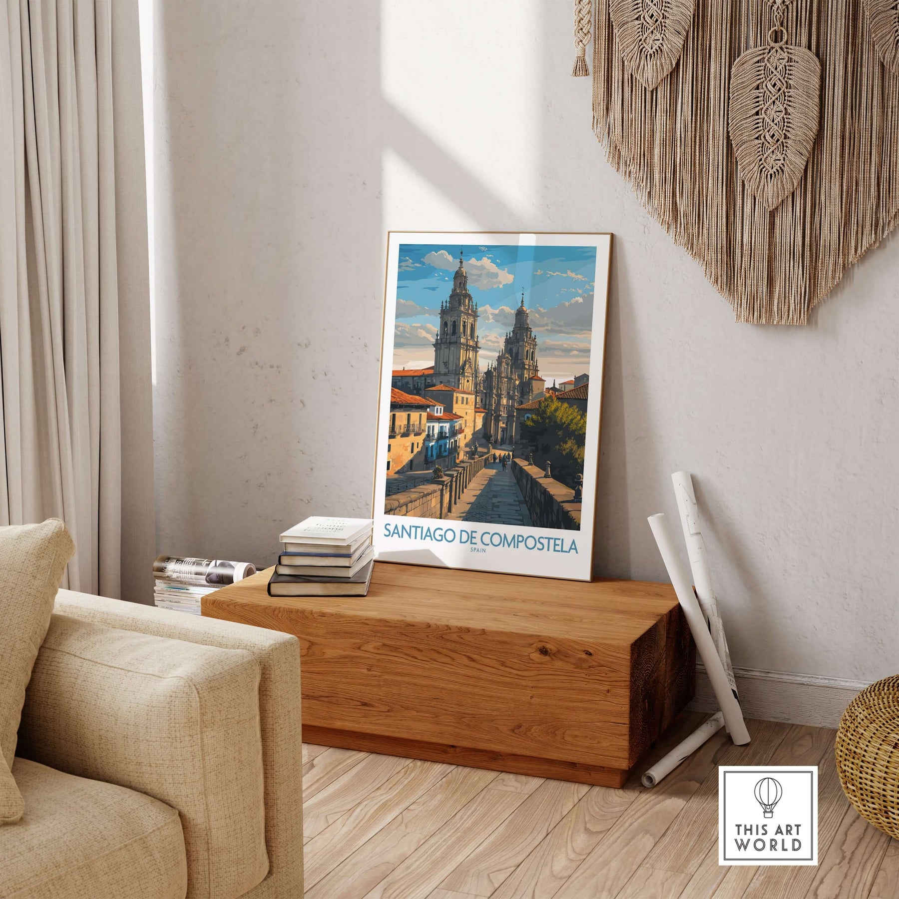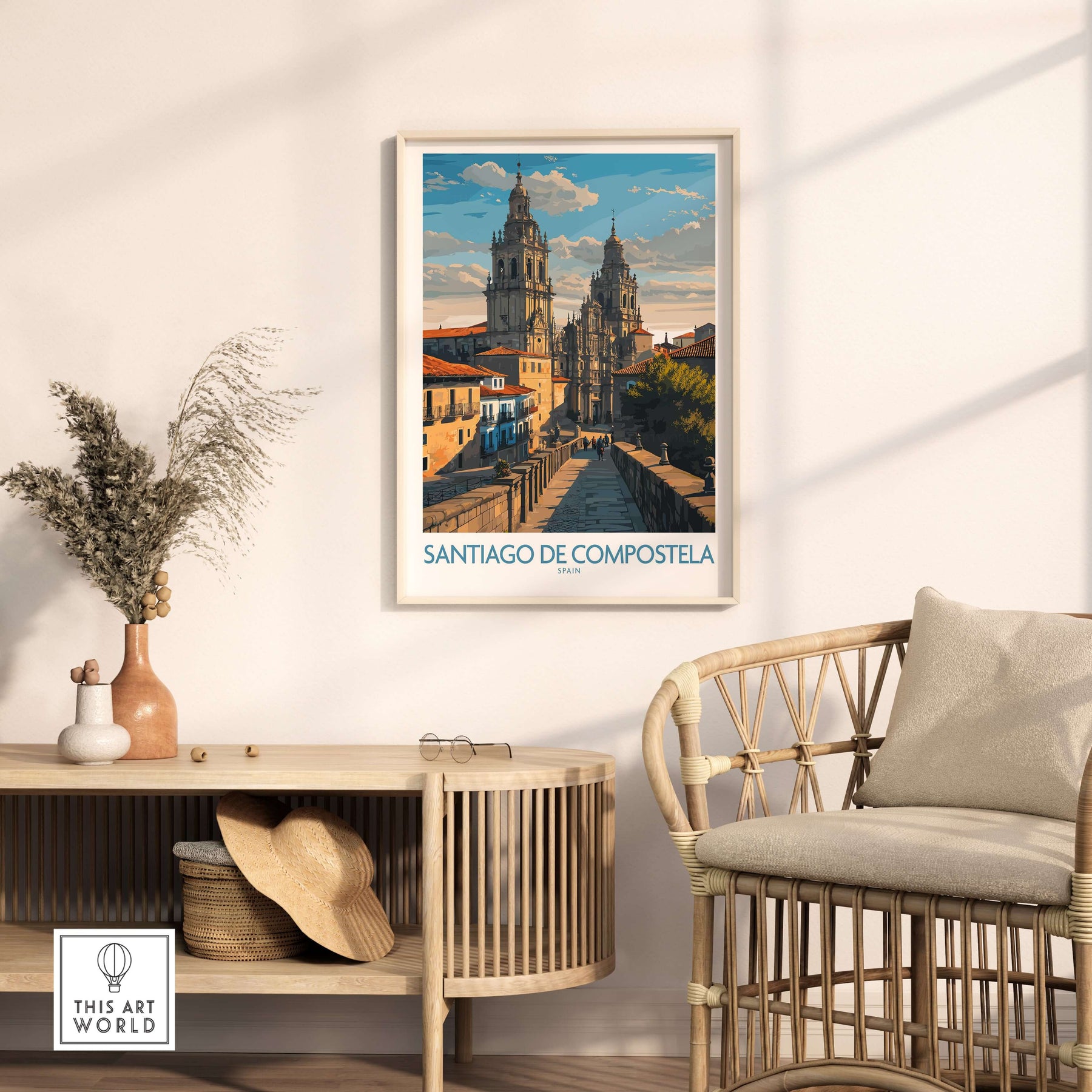 Santiago de Compostela Pilgrimage End Art Print | Cathedral Facade Poster showcased in a cozy living space setting.
