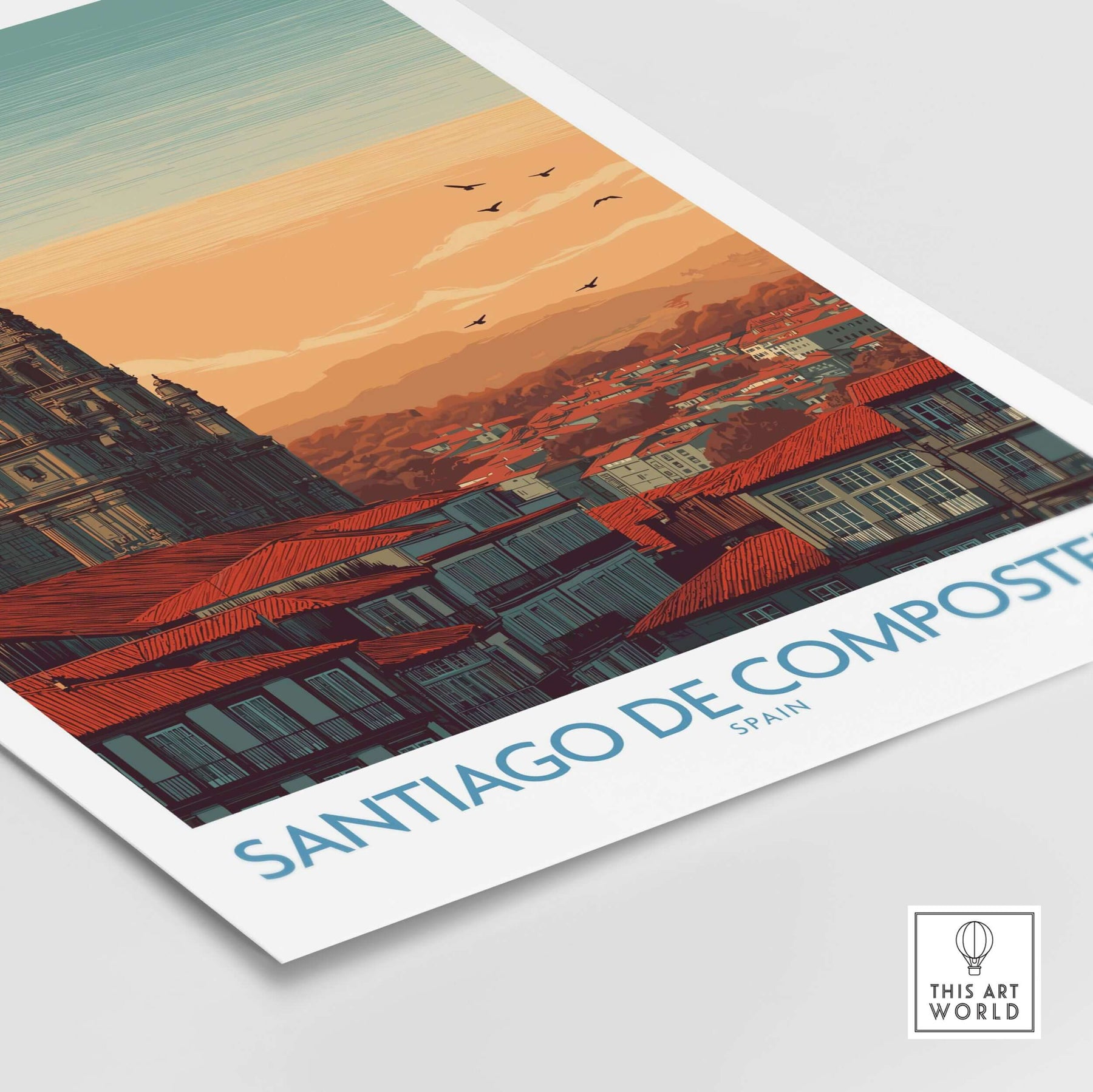 Santiago de Compostela Poster showcasing the city's skyline at sunset, featuring historic rooftops and cathedral spires.