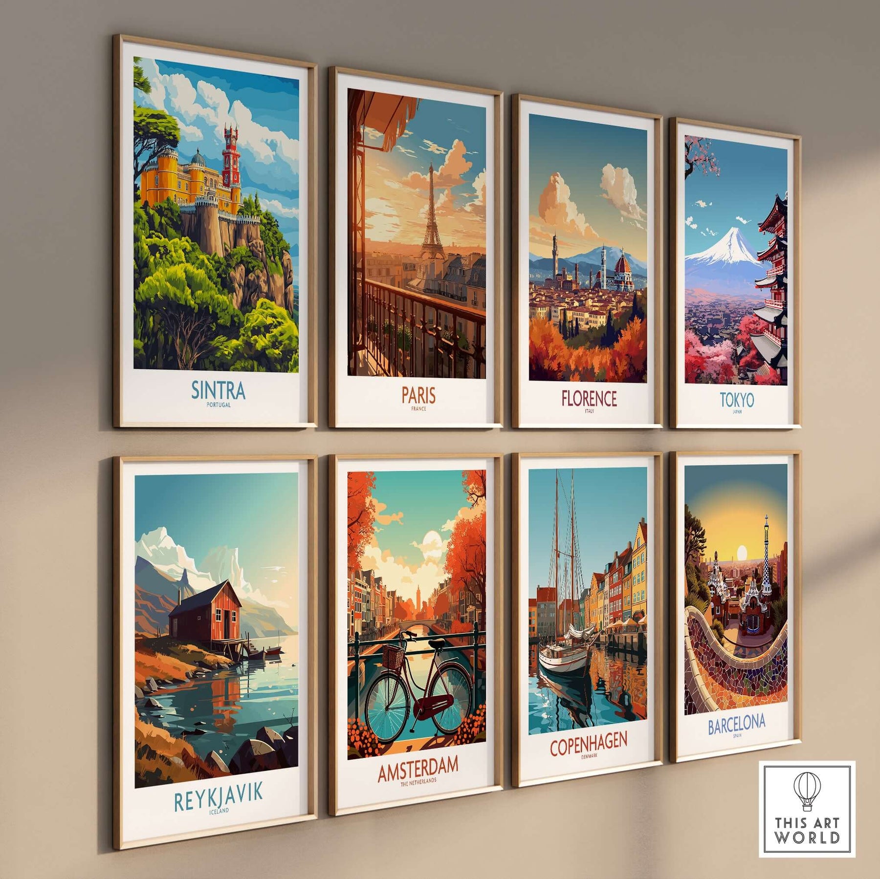 Sintra Portugal Pena Palace Art Print | Castle Poster showcased among various iconic city art prints on a wall.