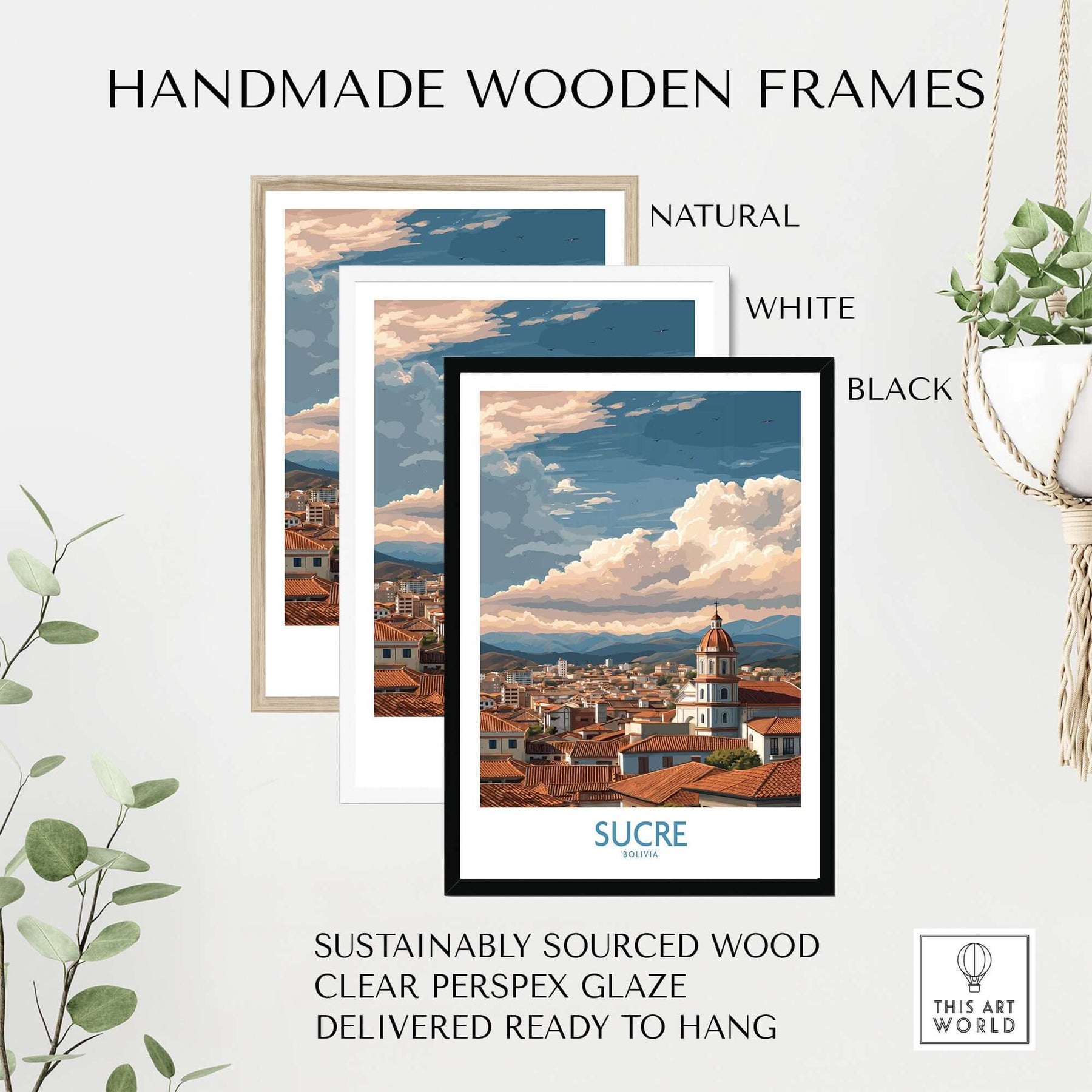 Sucre Bolivia Art Print | Mountain Skyline Poster displayed in handmade wooden frames in natural, white, and black finishes.