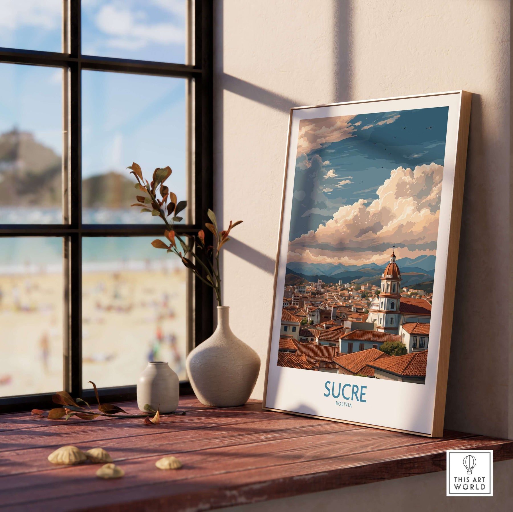 Sucre Bolivia Art Print | Mountain Skyline Poster displayed in a cozy living room setting on a wooden box.