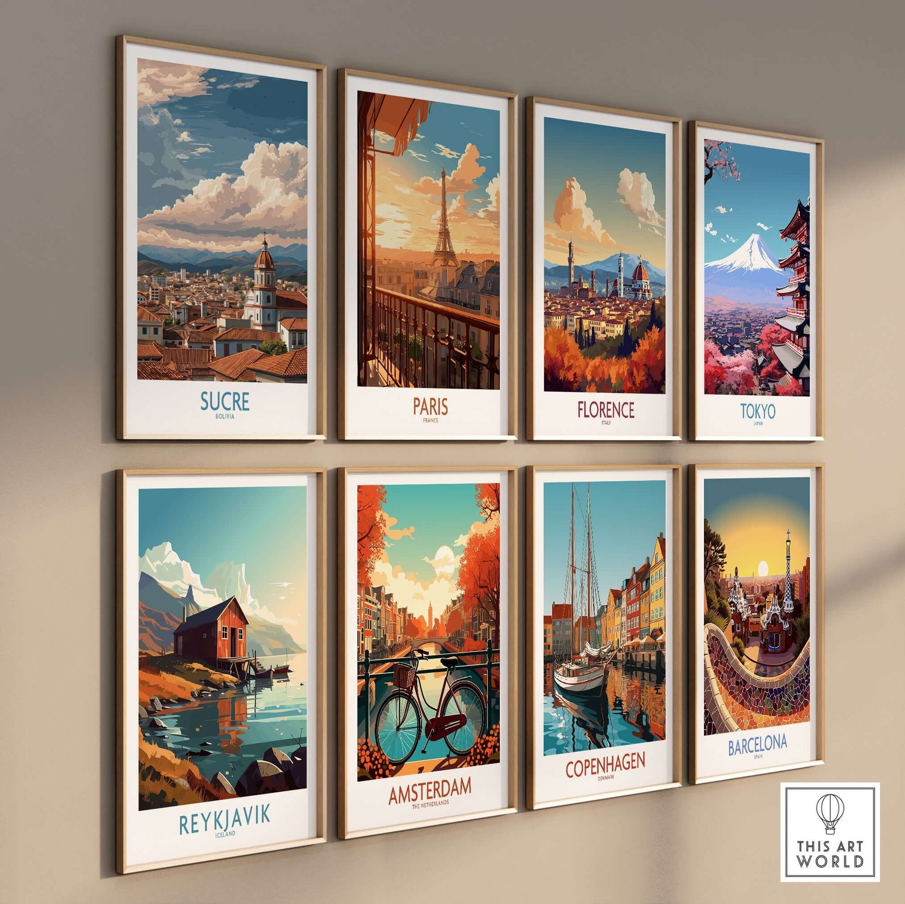 Sucre Bolivia Art Print | Mountain Skyline Poster displayed among other travel art prints on a wall.