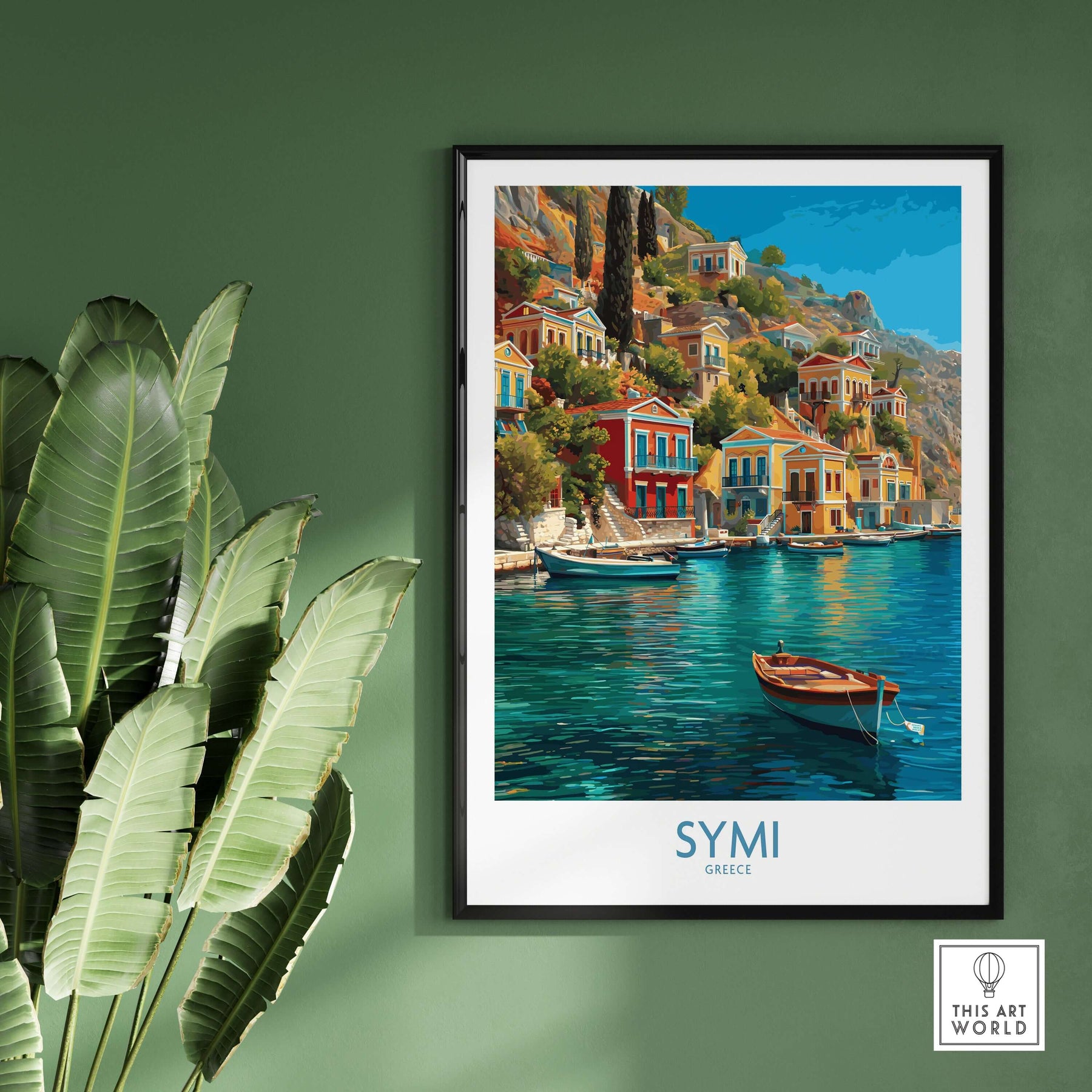 Symi Greece Art Print | Harbour Boats Seascape Poster displayed in a stylish interior with coastal decor.