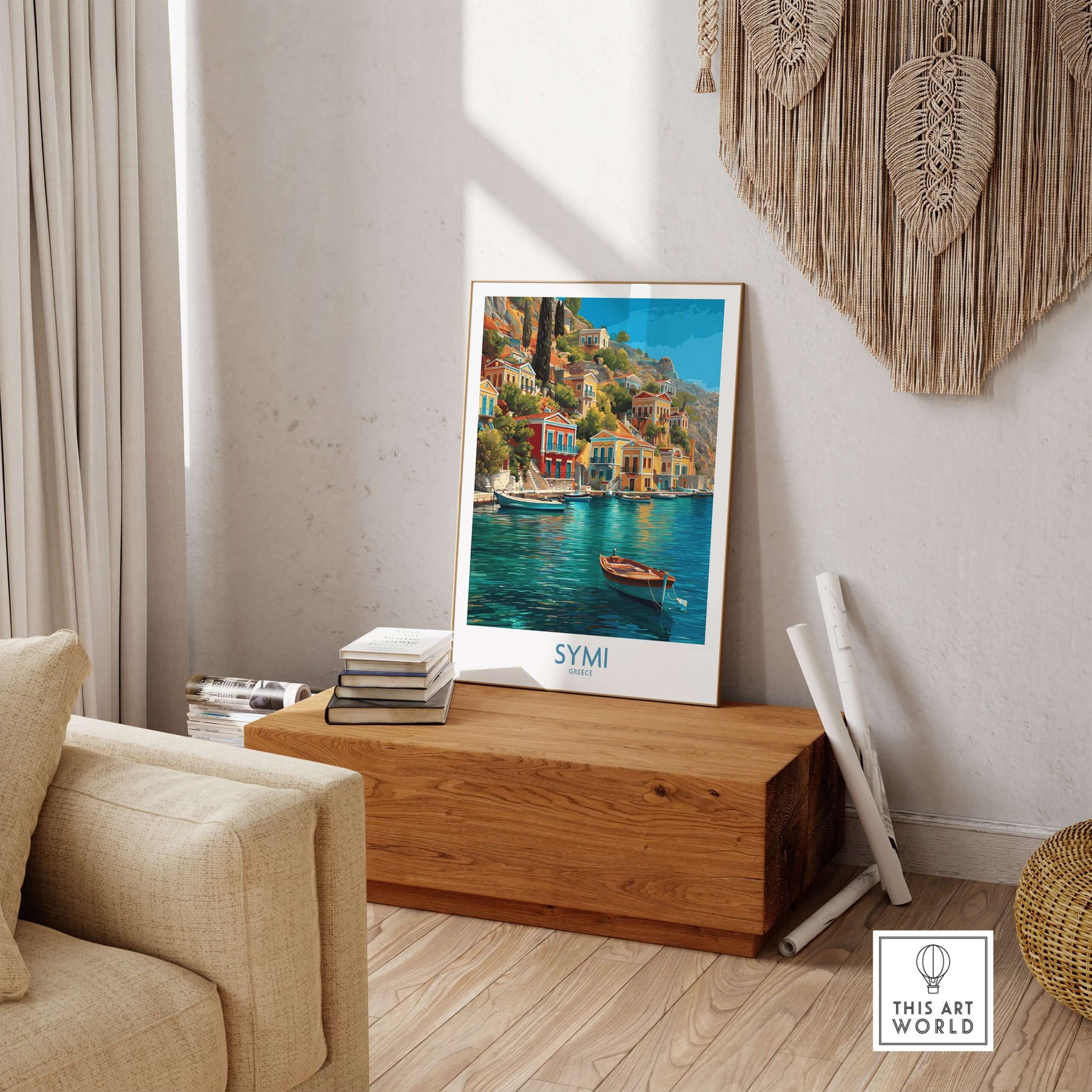 Symi Greece Art Print | Harbour Boats Seascape Poster showcased in a stylish living room setting.