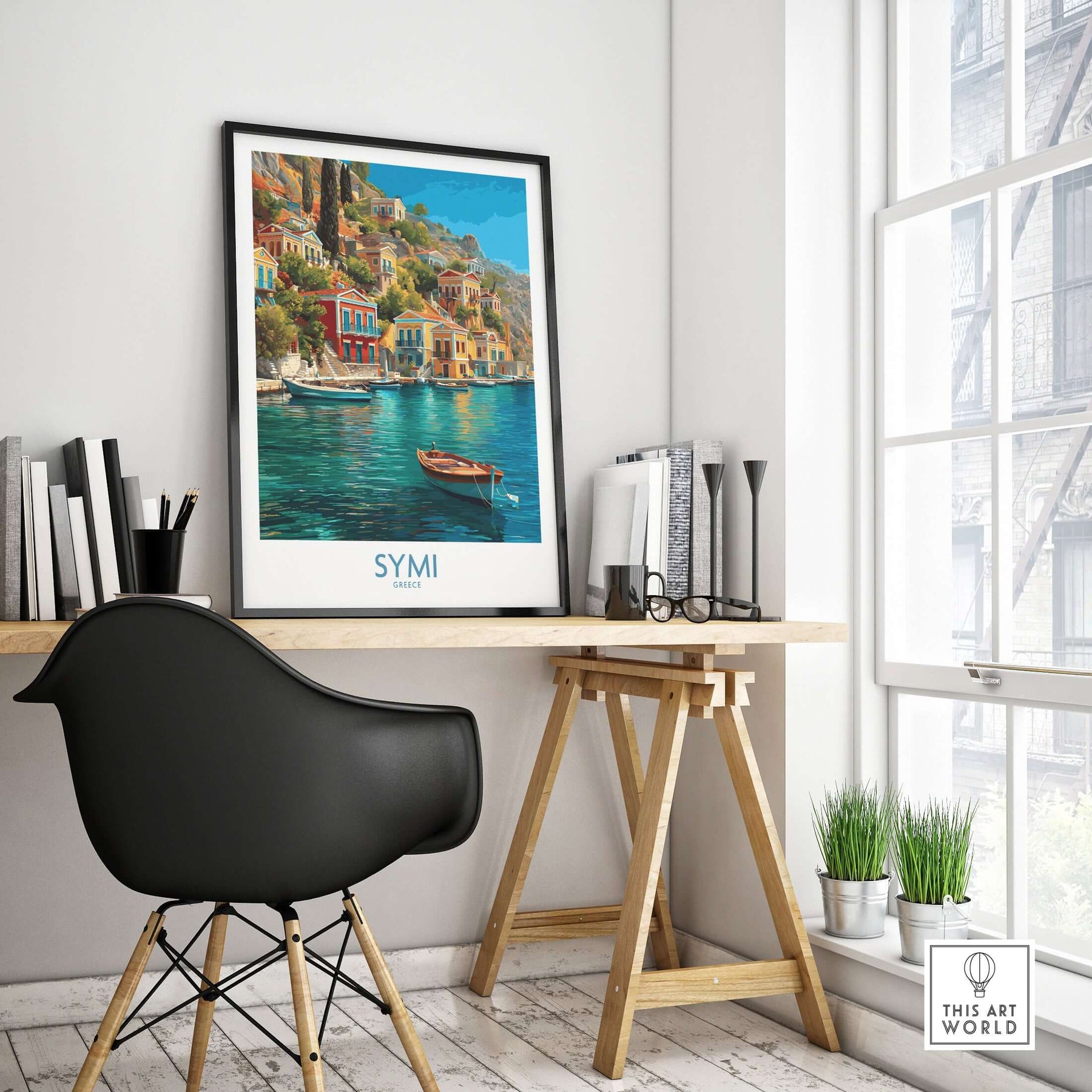 Symi Greece Art Print | Harbour Boats Seascape Poster displayed in a modern workspace.