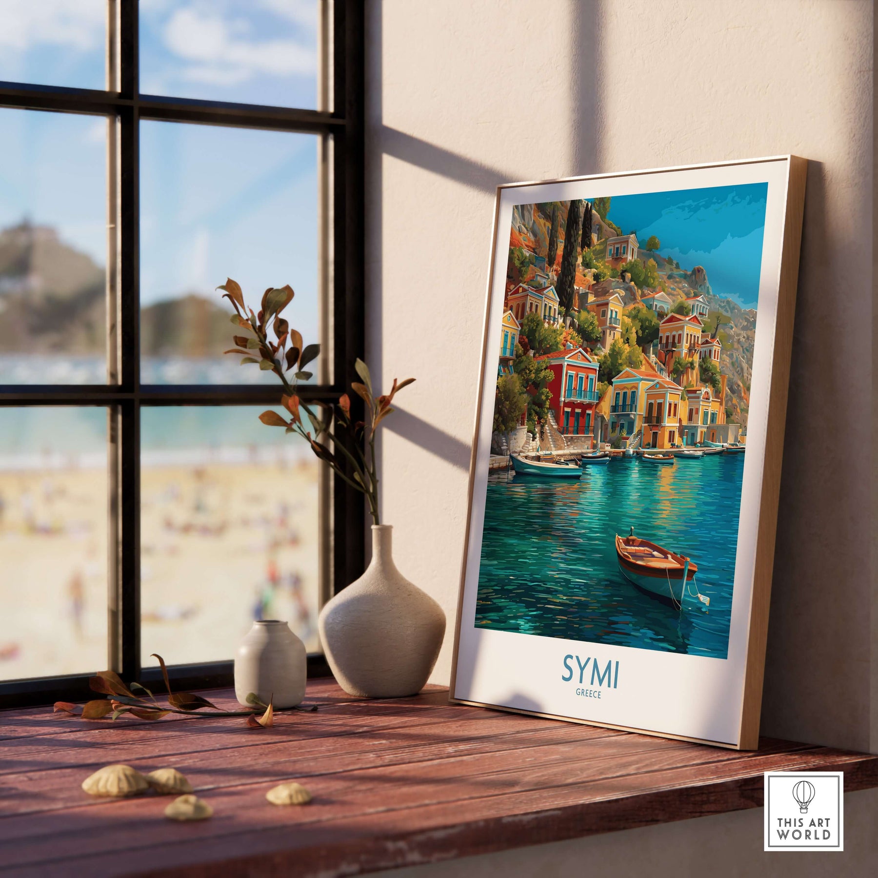 Symi Greece Art Print | Harbour Boats Seascape Poster displayed in a bright room with beach view.