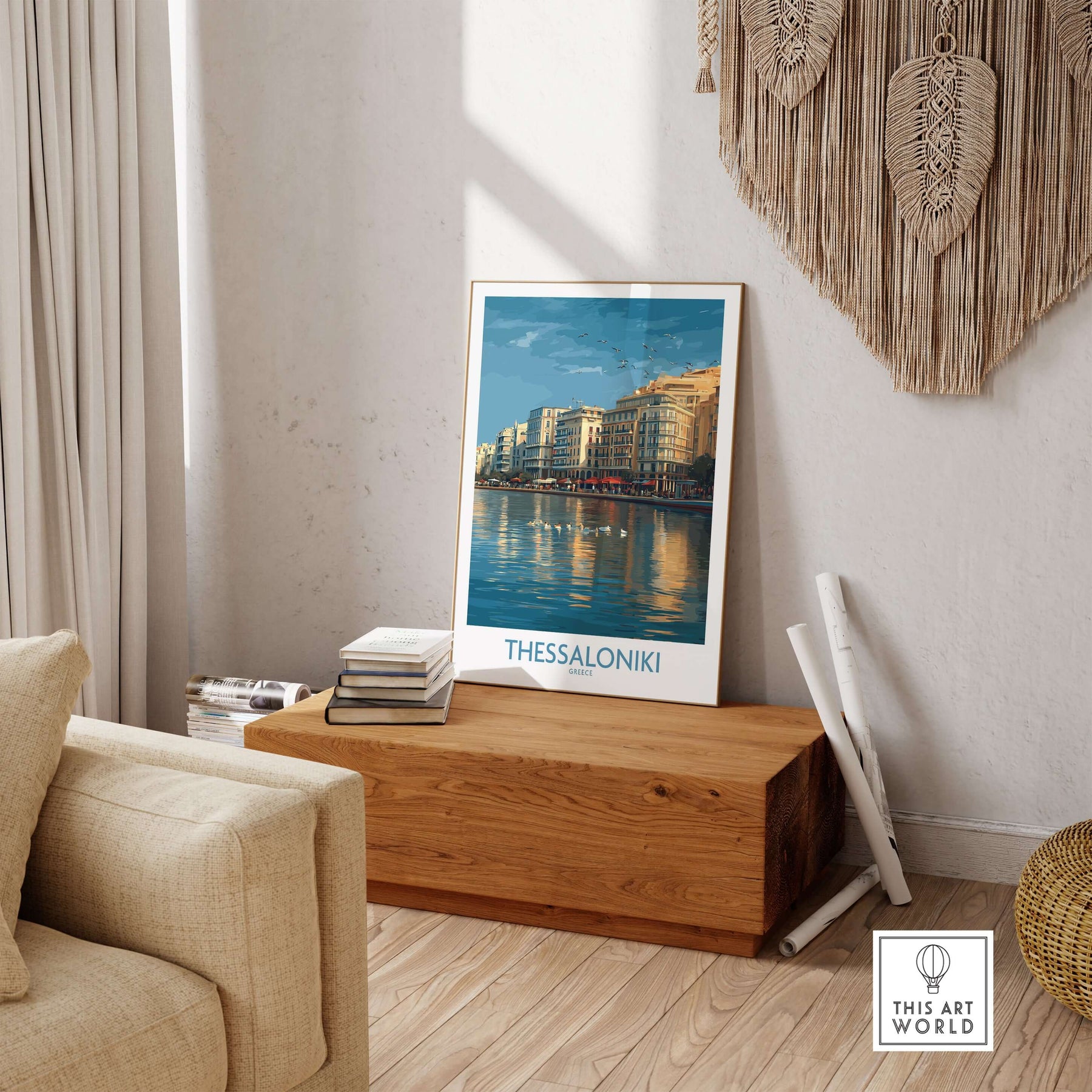 Thessaloniki Greece Art Print | City Poster displayed in a modern living room with a cozy atmosphere.