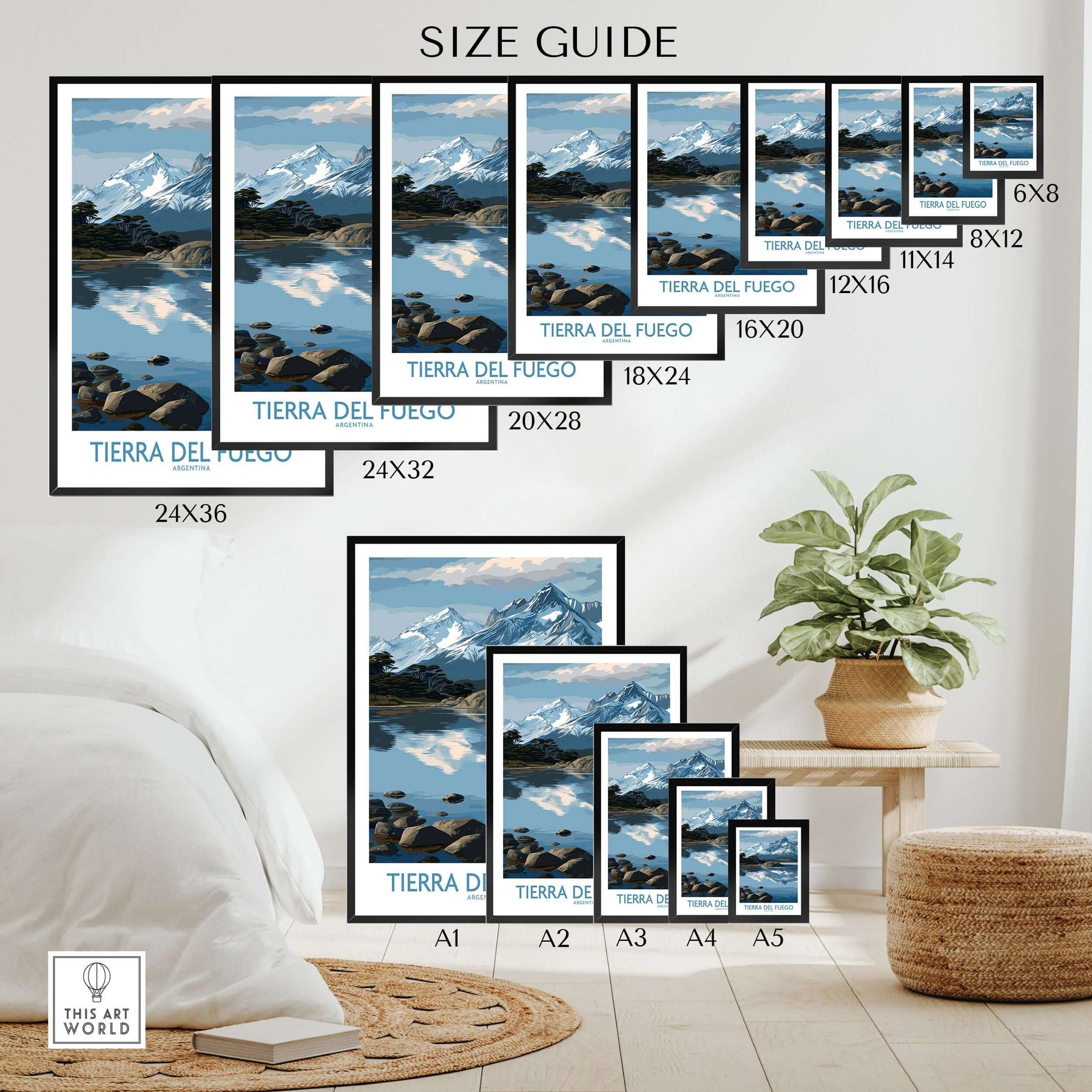 Tierra del Fuego Argentina Art Print | Glacial Lake Poster size guide with various frame dimensions displayed.