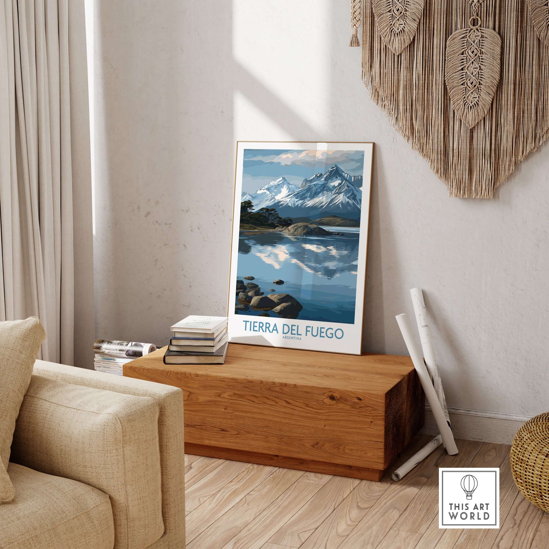 Tierra del Fuego Argentina Art Print | Glacial Lake Poster displayed in a cozy living room setting with natural decor.