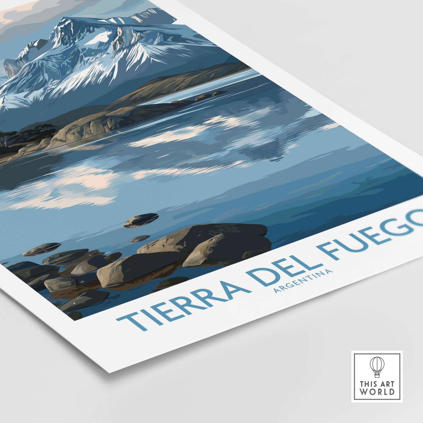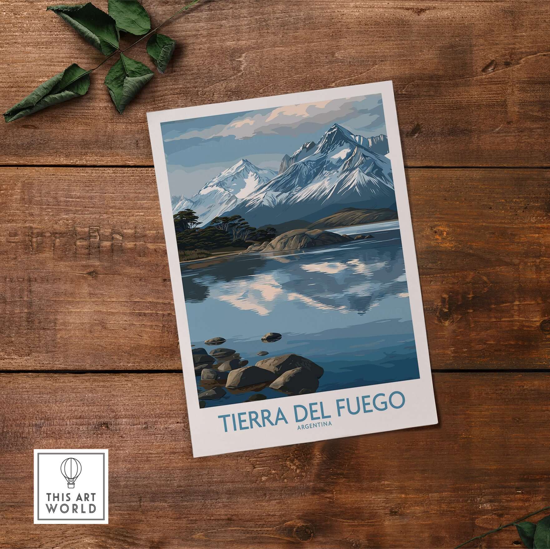 Experience the stunning wilderness of Tierra del Fuego with this breathtaking art print featuring a glacial lake framed by majestic mountains. This poster captures the pristine beauty and rugged serenity of Argentina’s southernmost region, bringing a touch of nature’s grandeur into your home. Perfect for lovers of remote landscapes and adventure, it adds a peaceful and inspiring atmosphere to any room. Celebrate the awe-inspiring allure of Tierra del Fuego with this captivating glacial lake artwork.