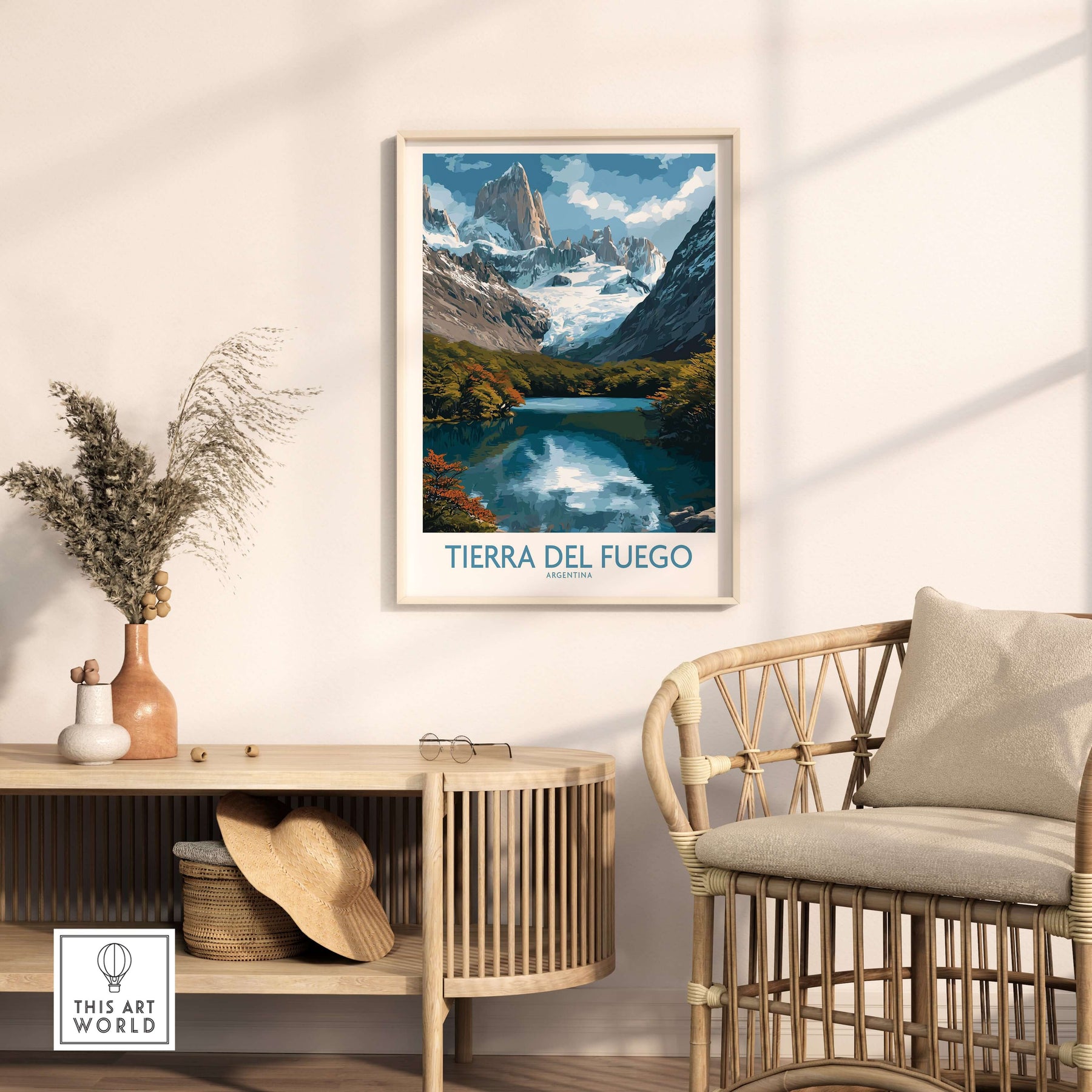Tierra del Fuego Argentina Fitz Roy Glacier Art Print | Mountain Lake Poster displayed in a modern living room setting.