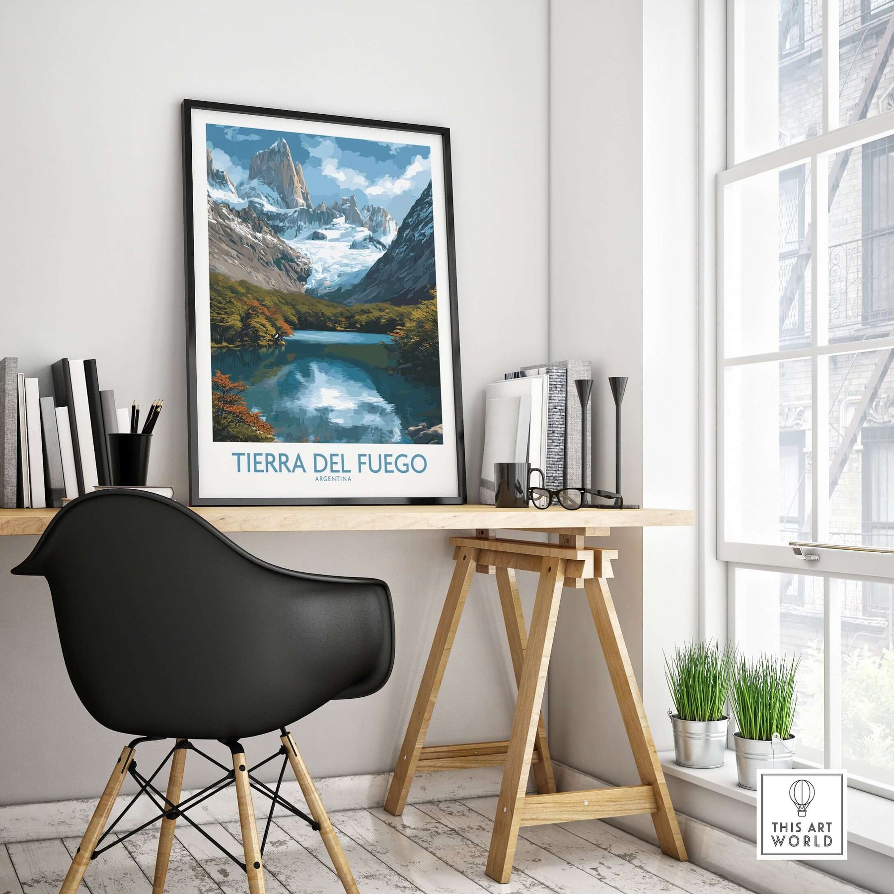 Tierra del Fuego Argentina Fitz Roy Glacier Art Print | Mountain Lake Poster displayed in a modern interior with a chair and desk.