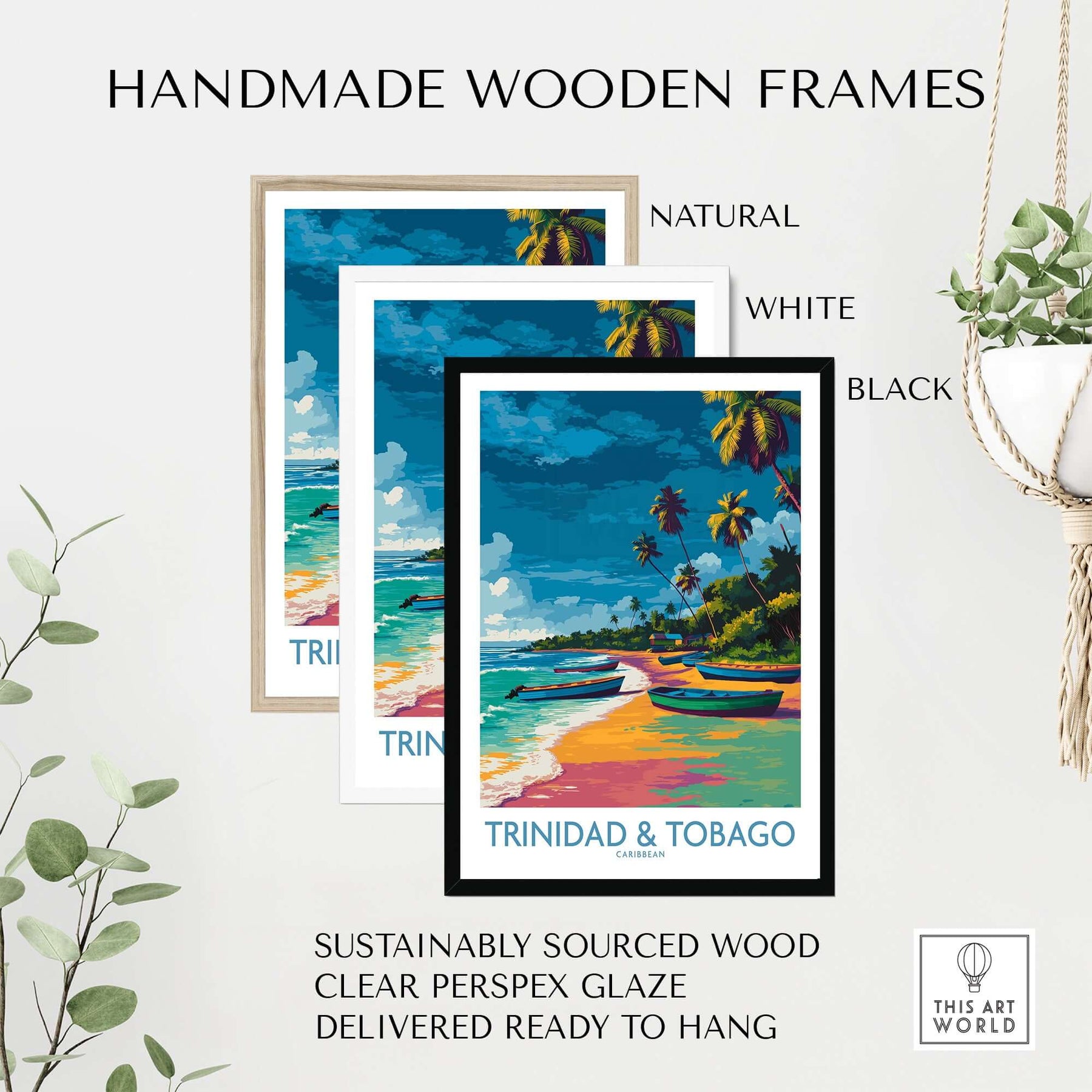 Trinidad & Tobago Print | Tropical Caribbean Poster framed in natural, white, and black handmade wooden frames.