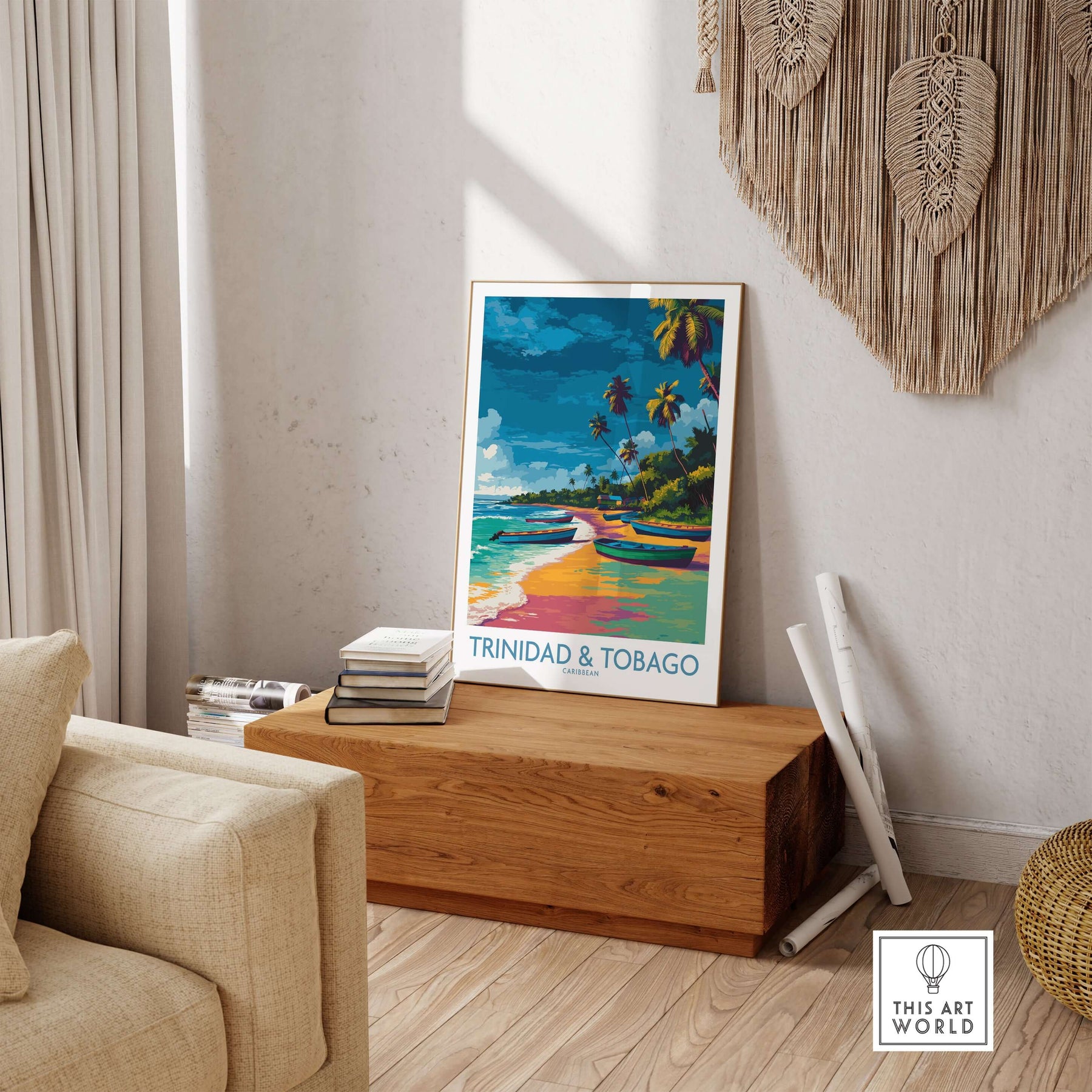 Trinidad & Tobago Print | Tropical Caribbean Poster displayed in a cozy living room setting with wooden decor.