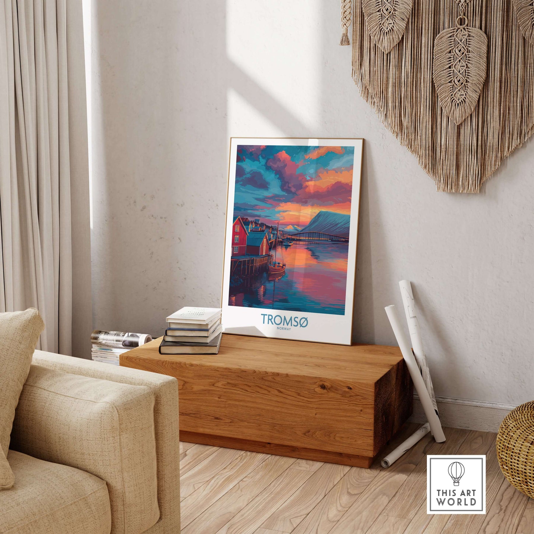 Tromsø Norway Arctic Art Print | Northern Lights Town Poster displayed in a cozy living room setting.