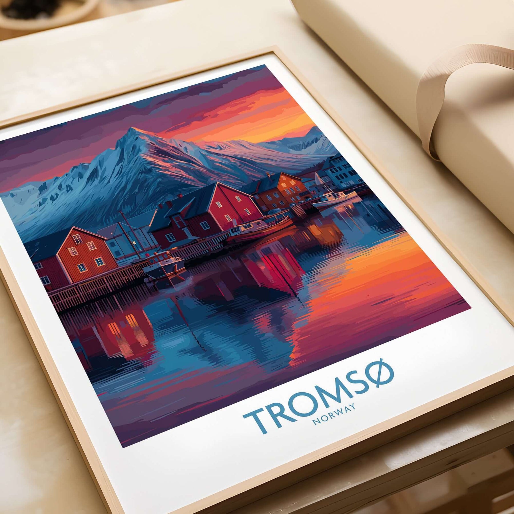 Tromsø Norway Art Print framed on a wooden table near a window, showcasing scenic Arctic beauty and coastal charm.