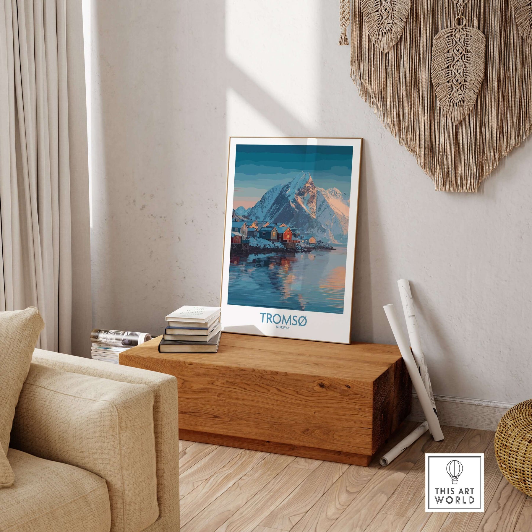 Tromsø Norway Art Print | Winter Village Poster displayed in a cozy interior with natural wood accents.