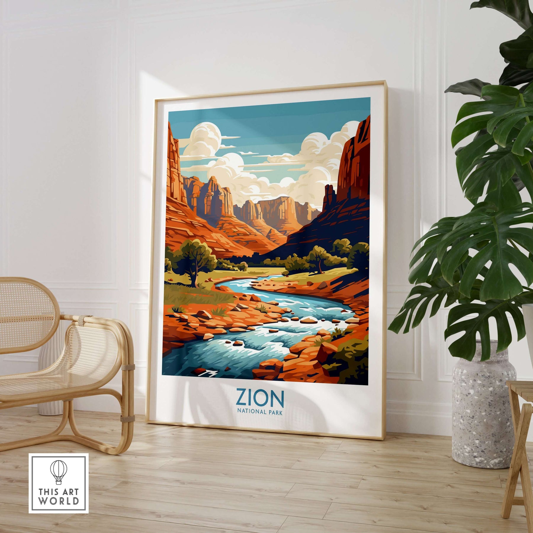 Zion National Park Art Print | Desert Landscape Poster featuring vibrant red rocks and a river in a modern setting.