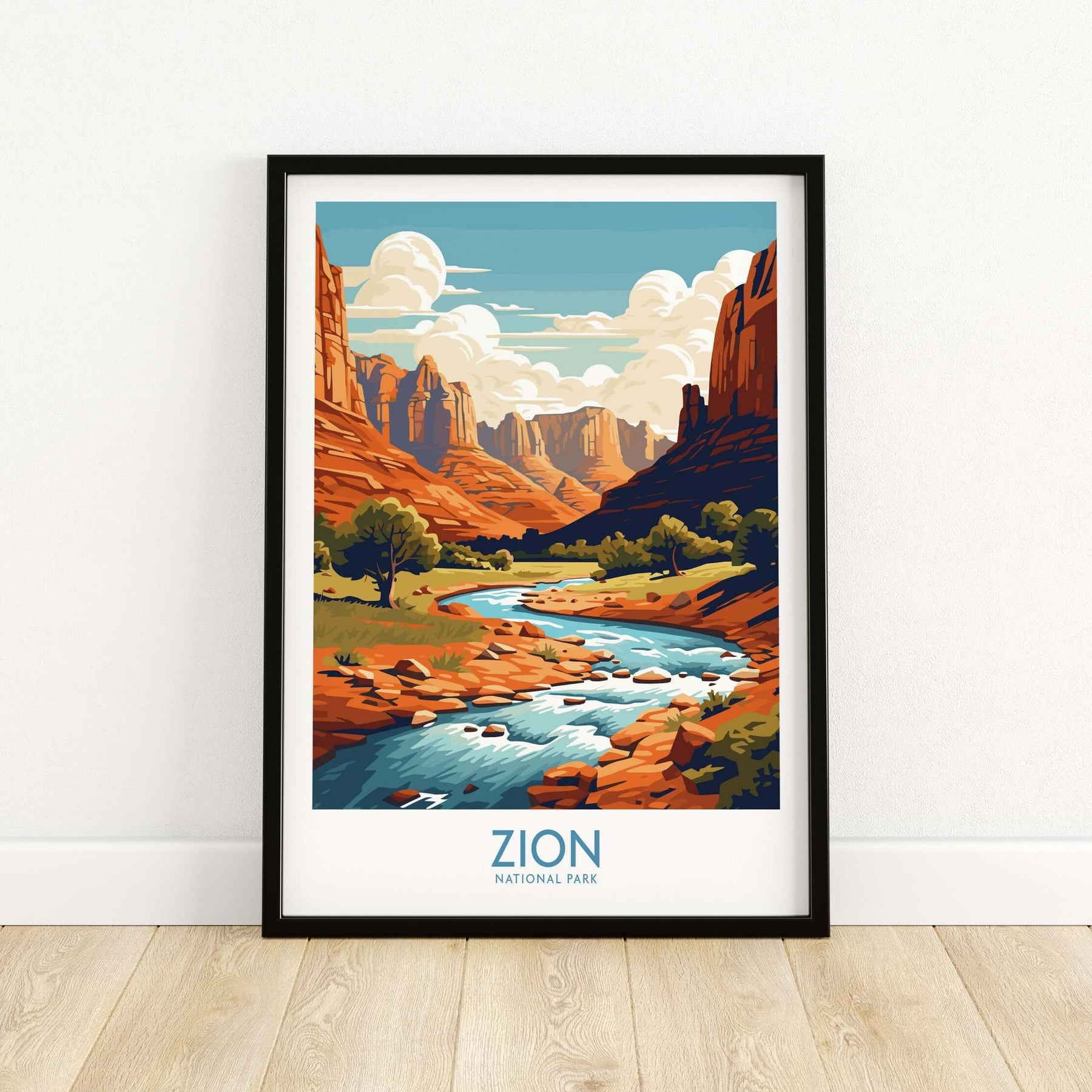 Zion National Park Art Print | Desert Landscape Poster showcasing vibrant red rock formations and river.