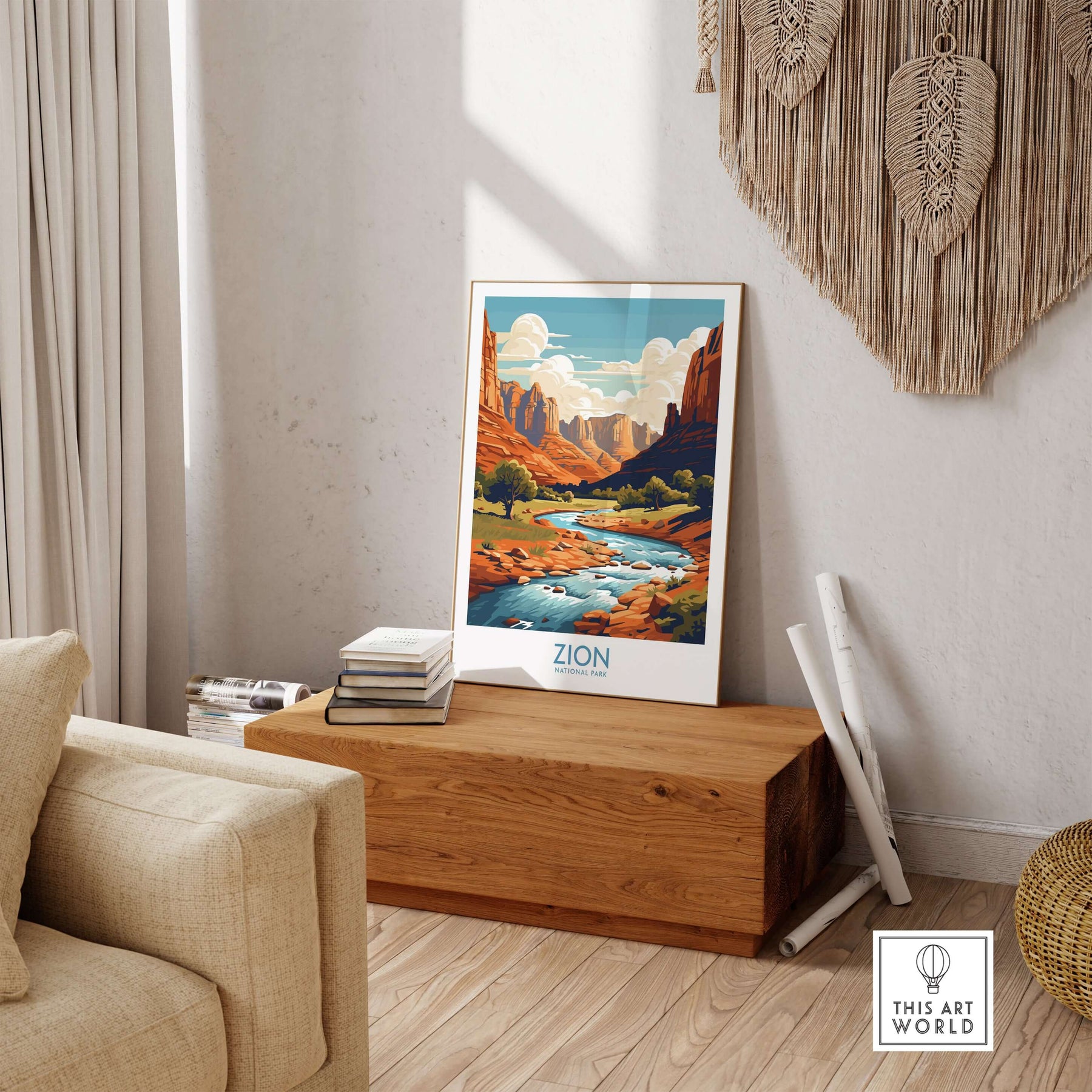 Zion National Park Art Print | Desert Landscape Poster displayed in a cozy living room setting.