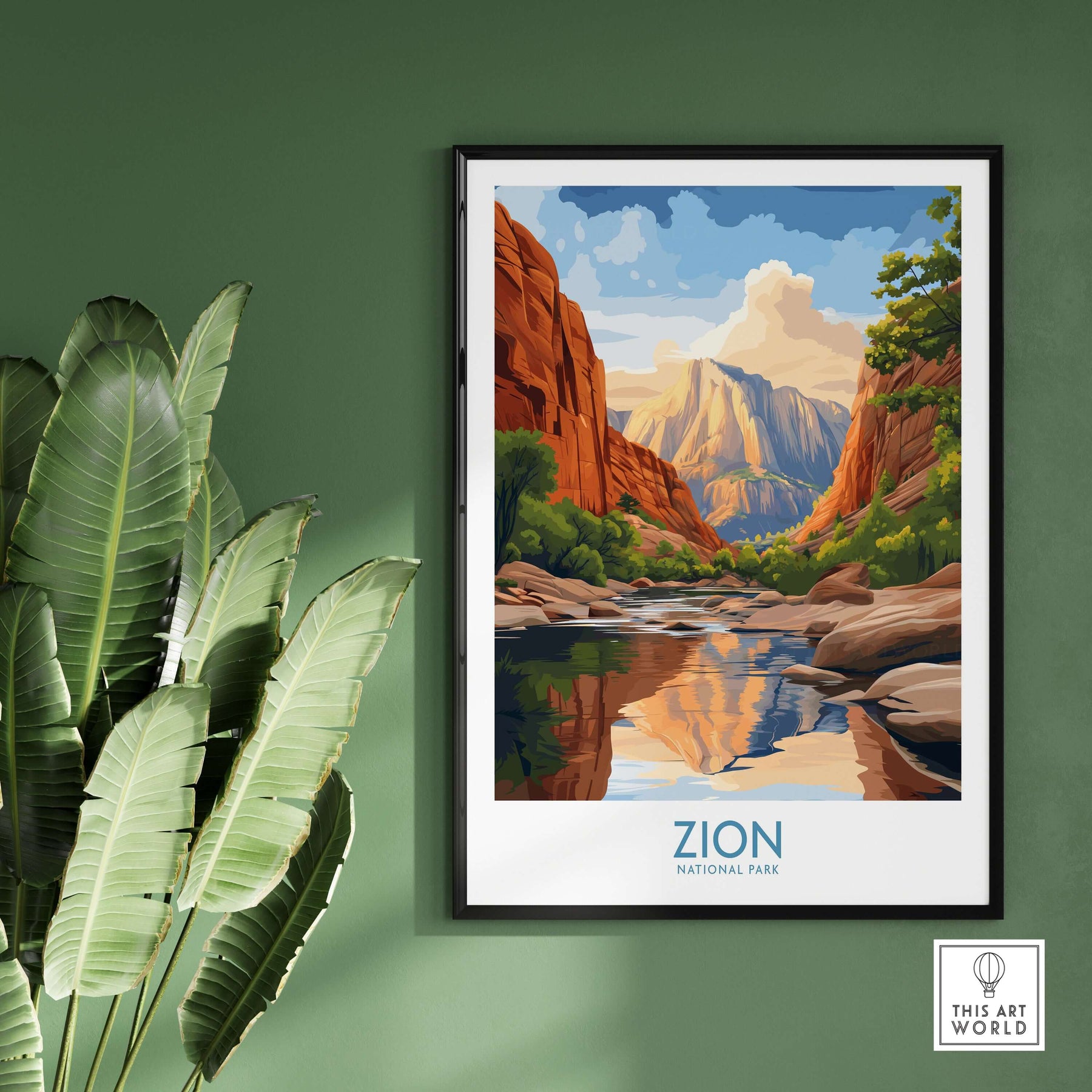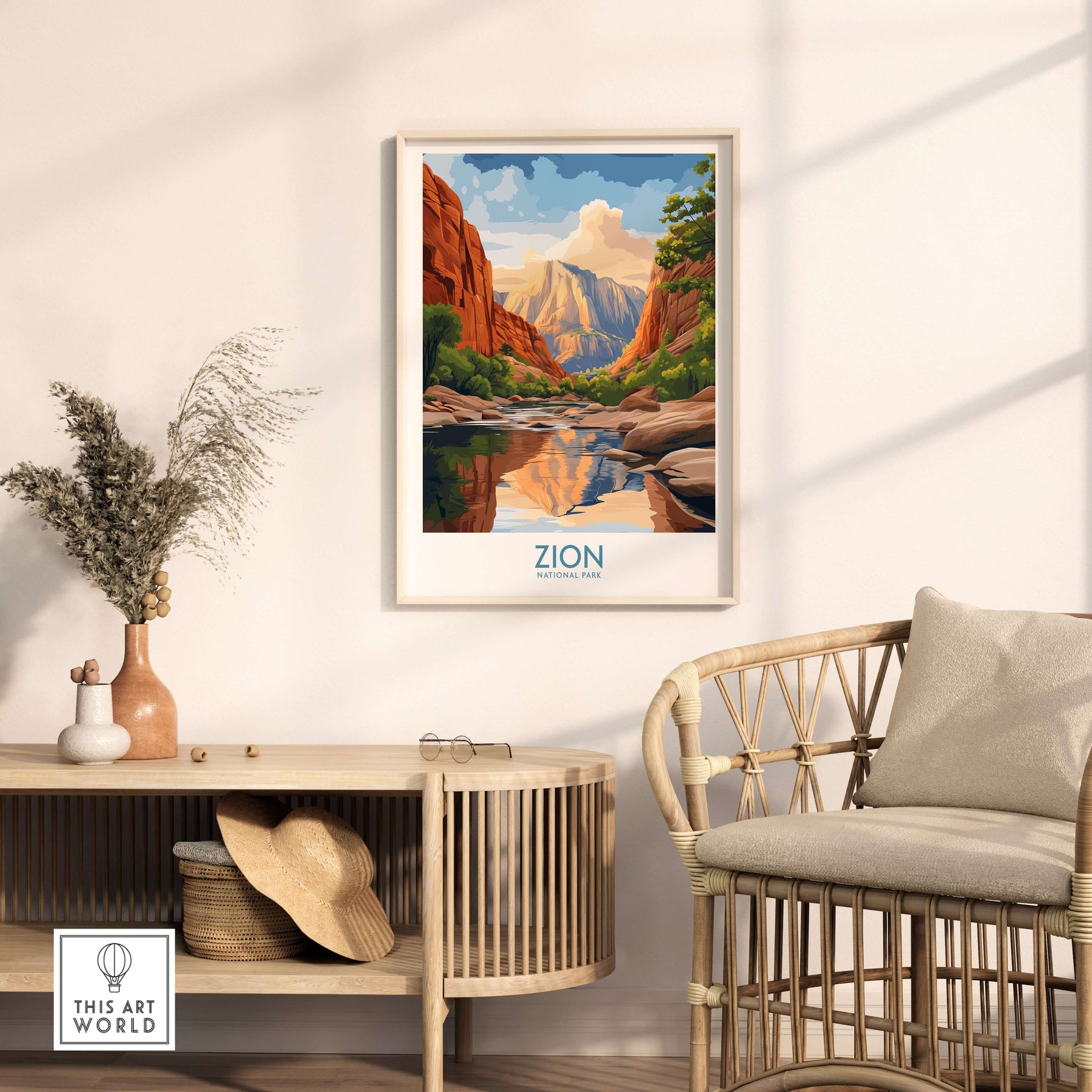 Zion National Park Poster | Canyon Walls Print showcasing vibrant canyon walls and reflection in living room setting.