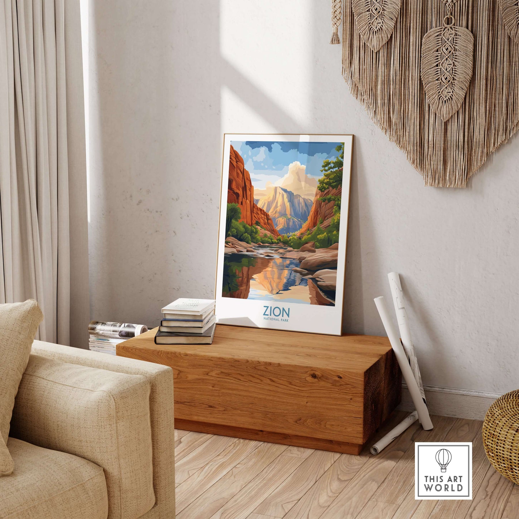 Zion National Park Poster | Canyon Walls Print displayed among travel art posters on a comfortable sofa.