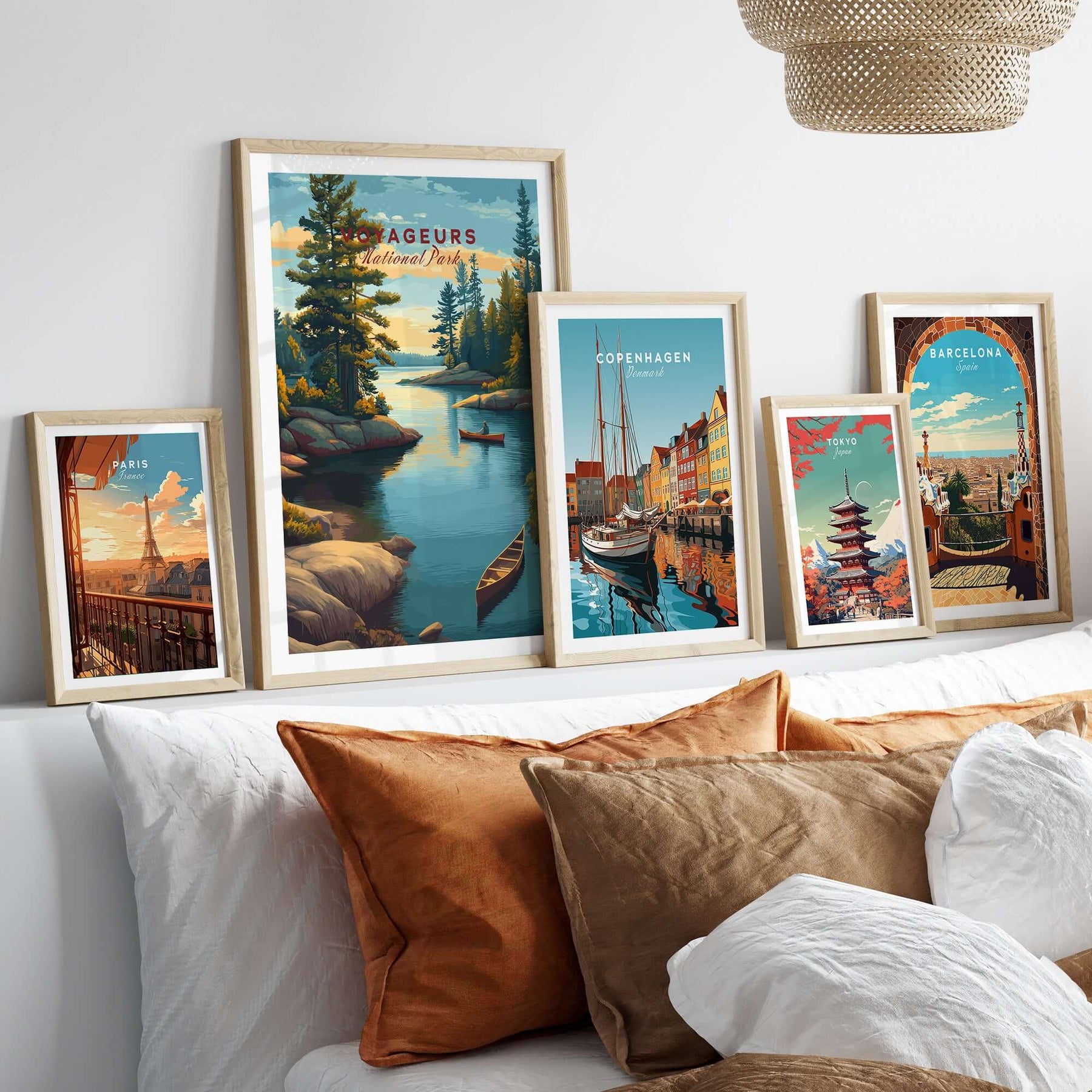 Voyageurs Print | American National Park Wall Decor among framed travel poster wall art from various cities.