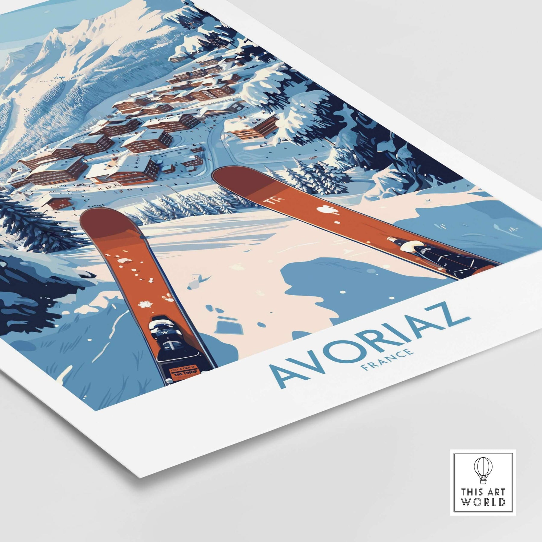 Avoriaz France Ski  Art Print | Mountain Chalet Poster showcasing a snowy alpine landscape and ski equipment.