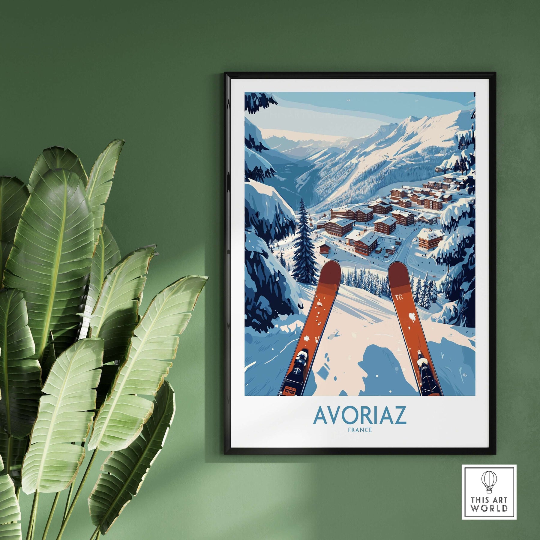Avoriaz France Ski Art Print | Mountain Chalet Poster displayed in a cozy interior setting with skis and mountain views.