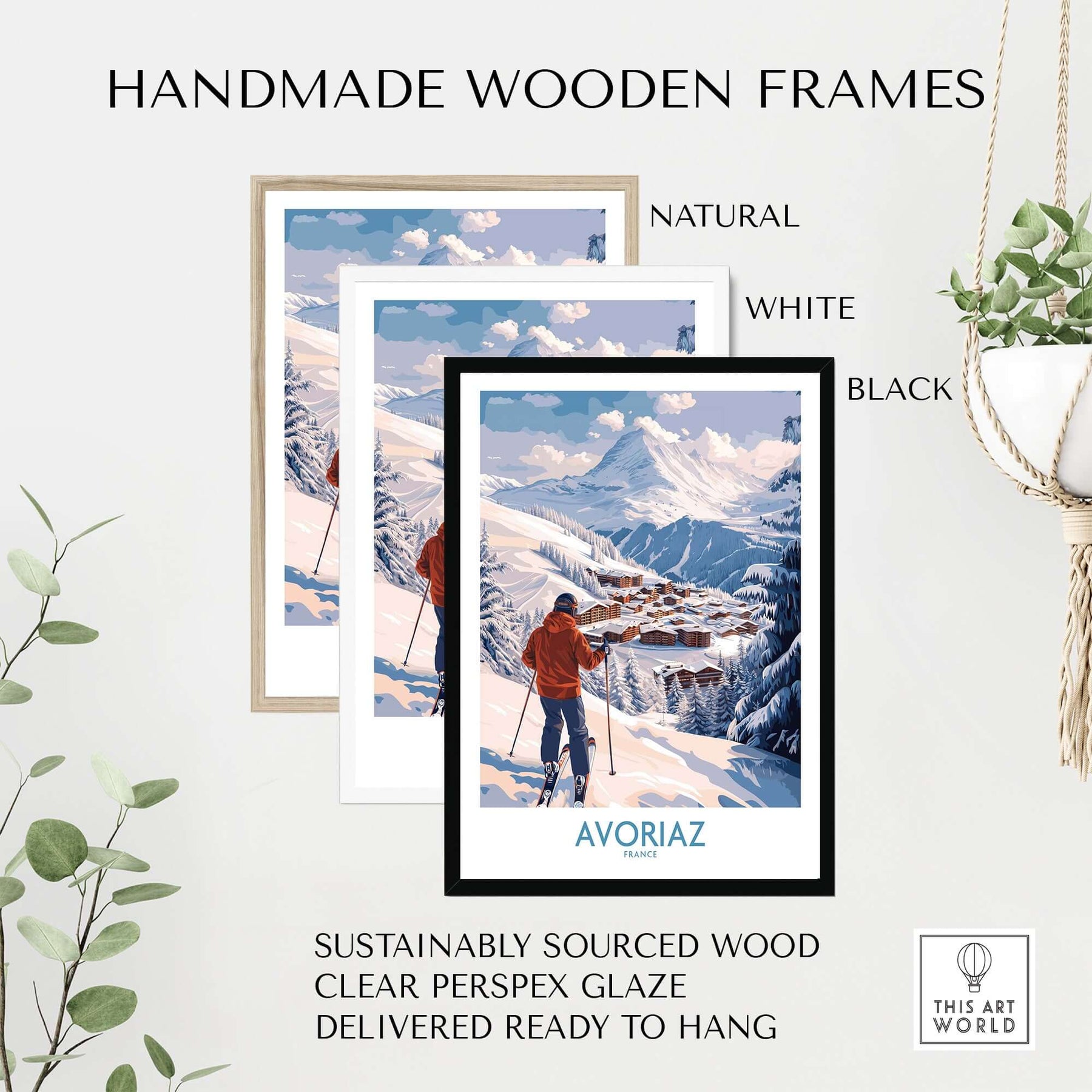 Avoriaz France Ski Chalet Village Art Print | Alpine Skiing Poster framed in handmade wooden frames.