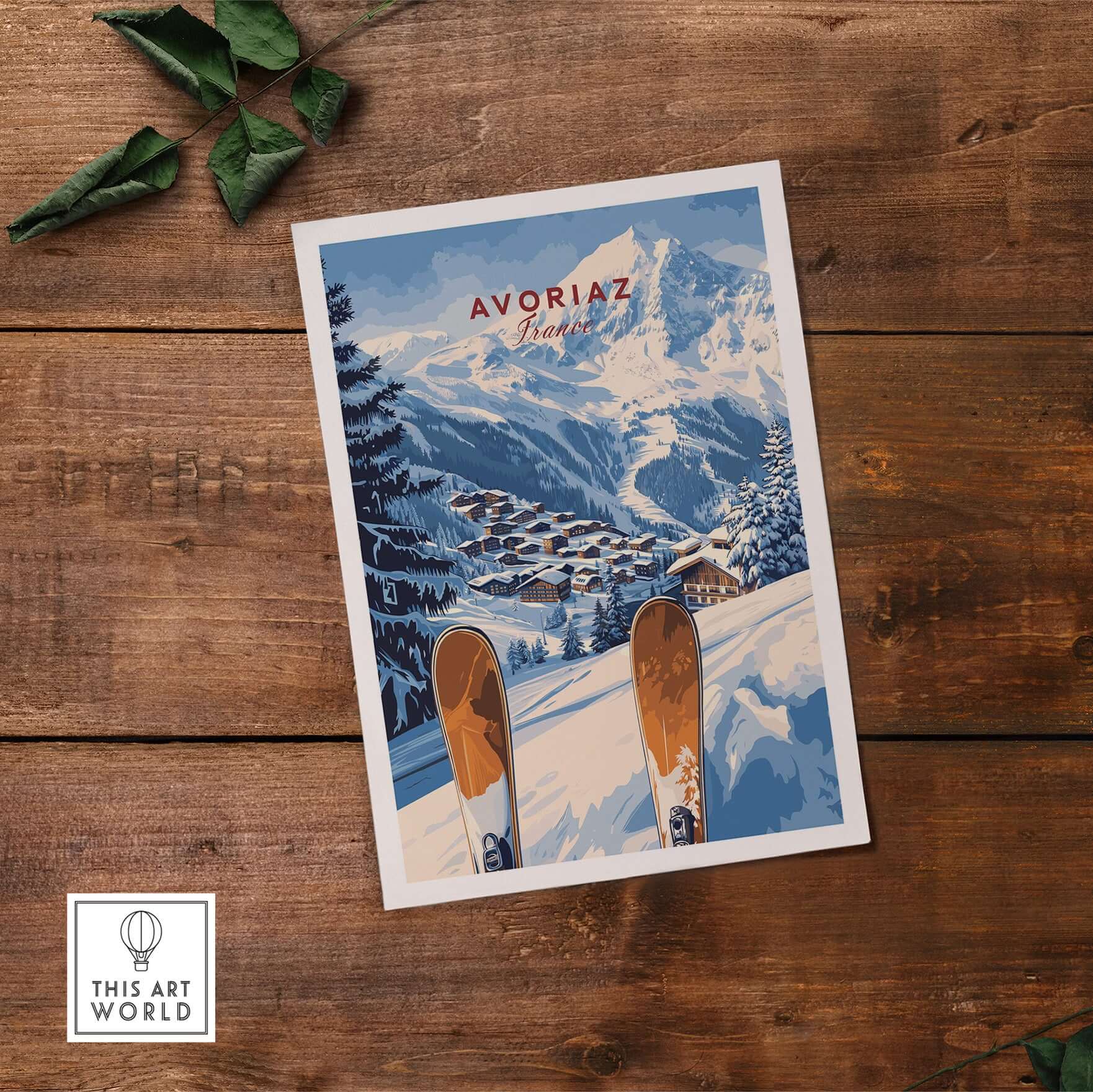 Avoriaz Ski Resort Print | French Alps Winter Wall Art showcasing snowy slopes and ski gear.