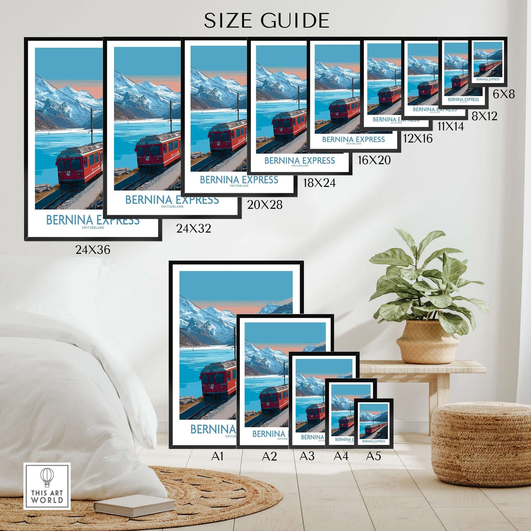Bernina Express Poster Switzerland Train Art Print | Alpine Rail Journey Poster Size Guide with different frame options