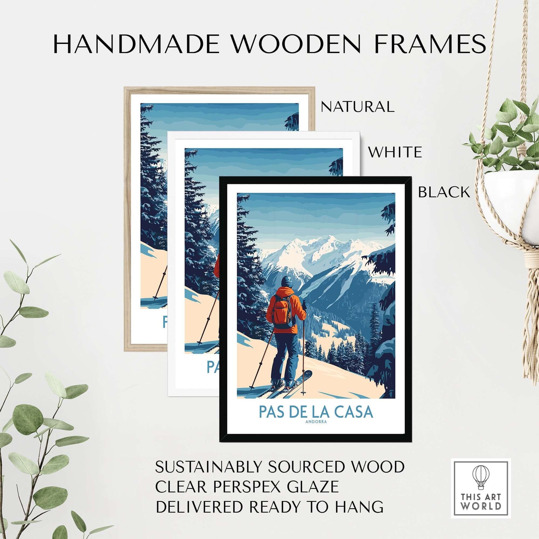Pas de la Casa Andorra Ski Print | Pyrenees Winter Poster displayed in handmade wooden frames in natural, white, and black.