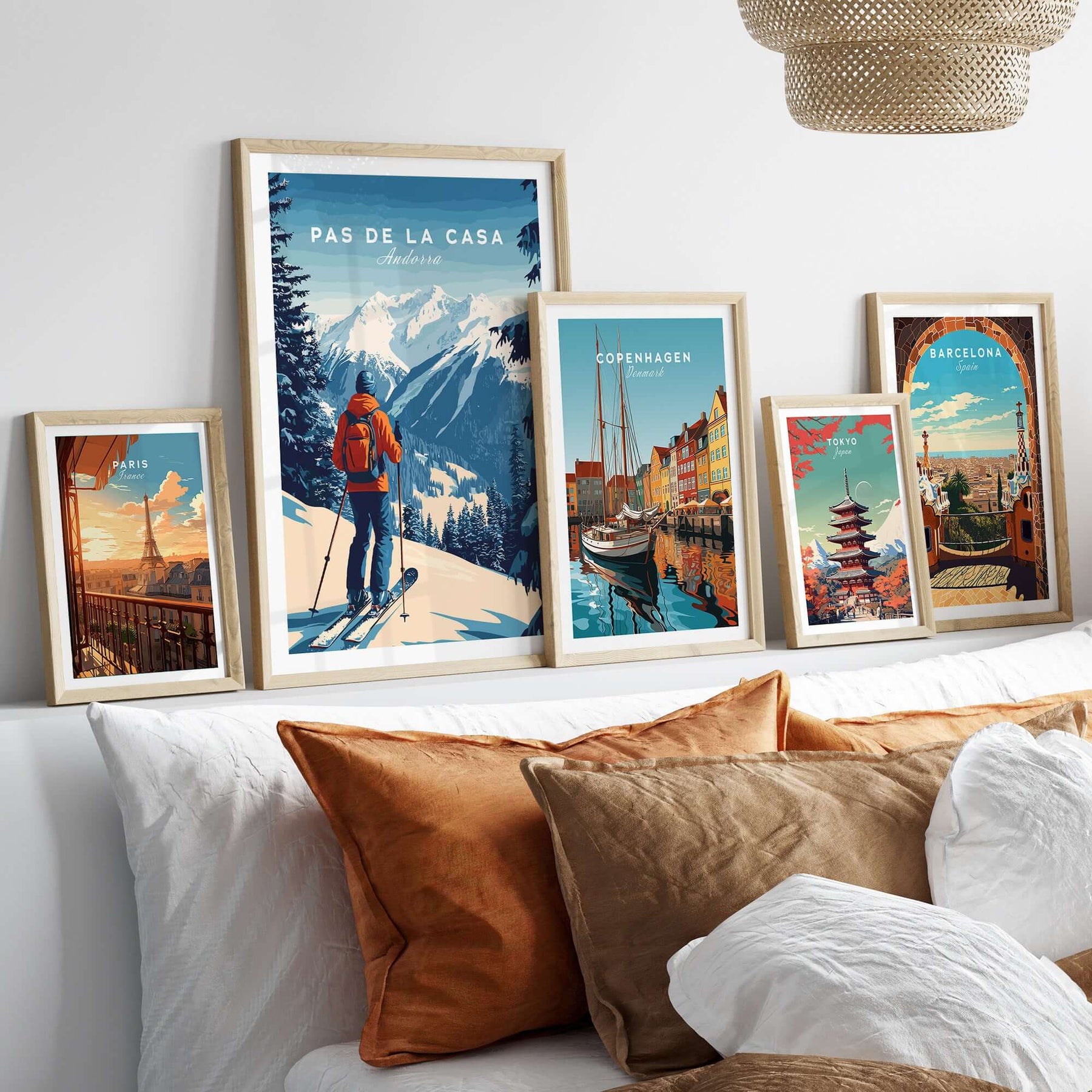 Handmade wooden frames in natural, white, and black for Pas de la Casa Poster Grandvalira Ski Print | Snow and Ski Wall Decor.