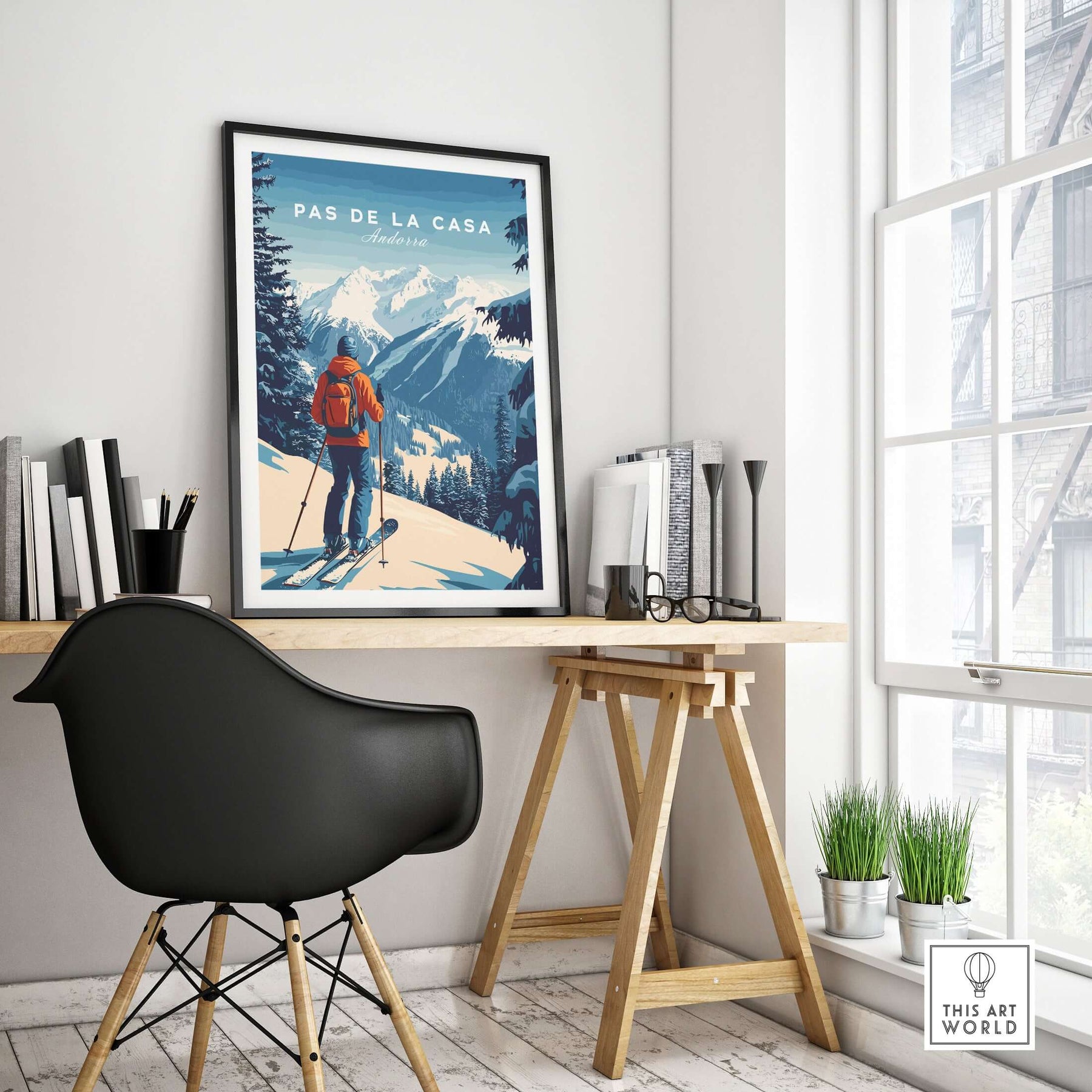 Pas de la Casa Poster Grandvalira Ski Print | Snow and Ski Wall Decor in stylish workspace with desk and chair.