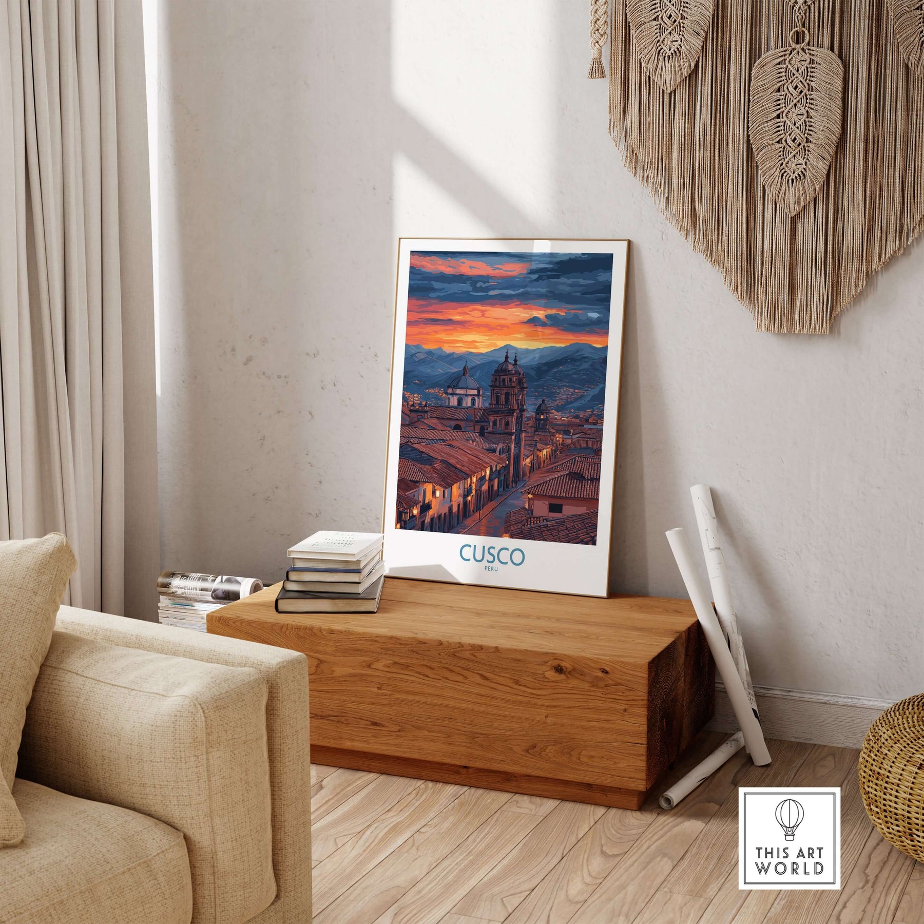 Cusco Peru Twilight Cityscape Art Print | Historic Rooftops Poster displayed in a modern living room setting.
