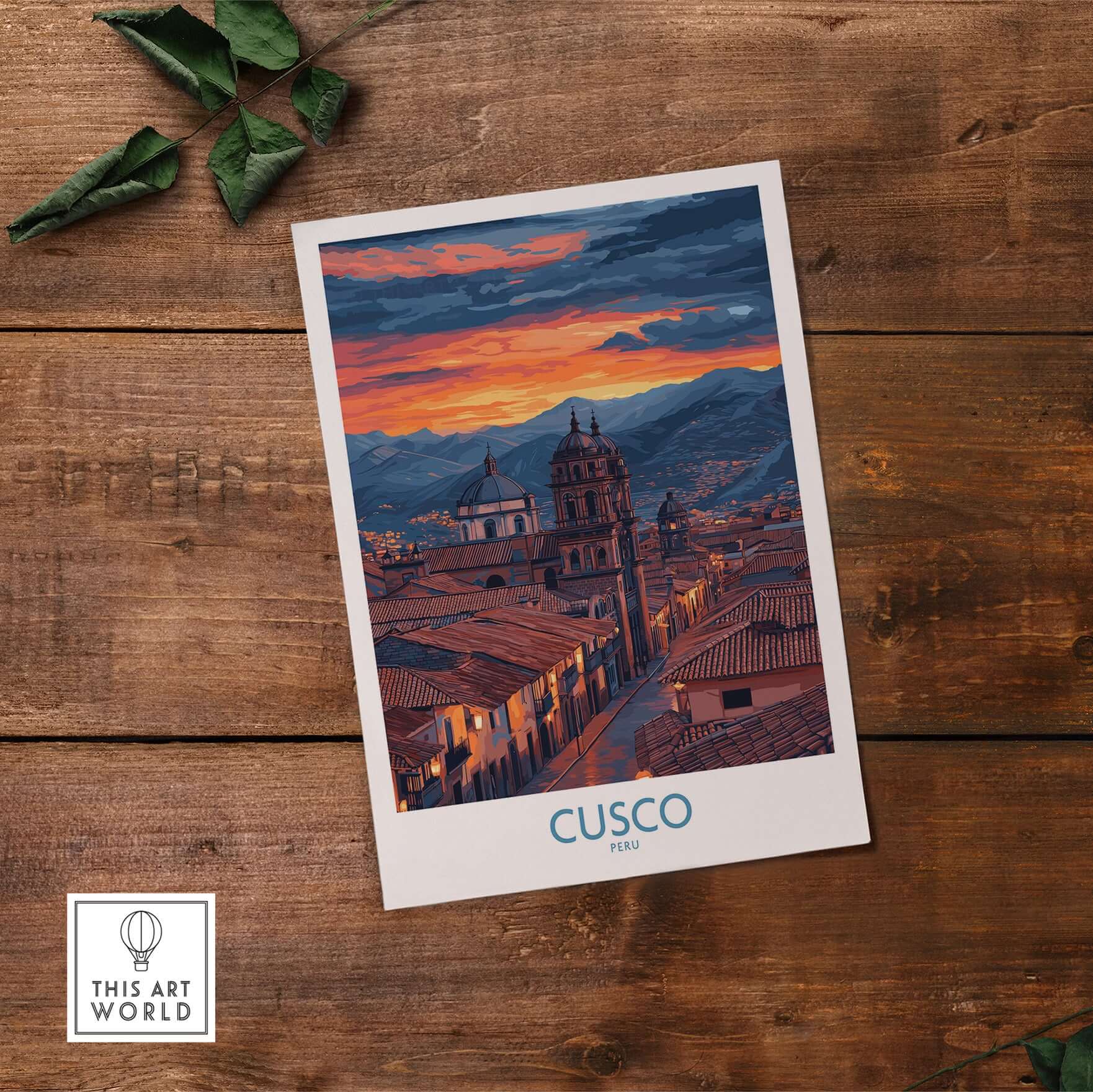 Cusco Peru Twilight Cityscape Art Print | Historic Rooftops Poster displayed in a cozy interior setting.