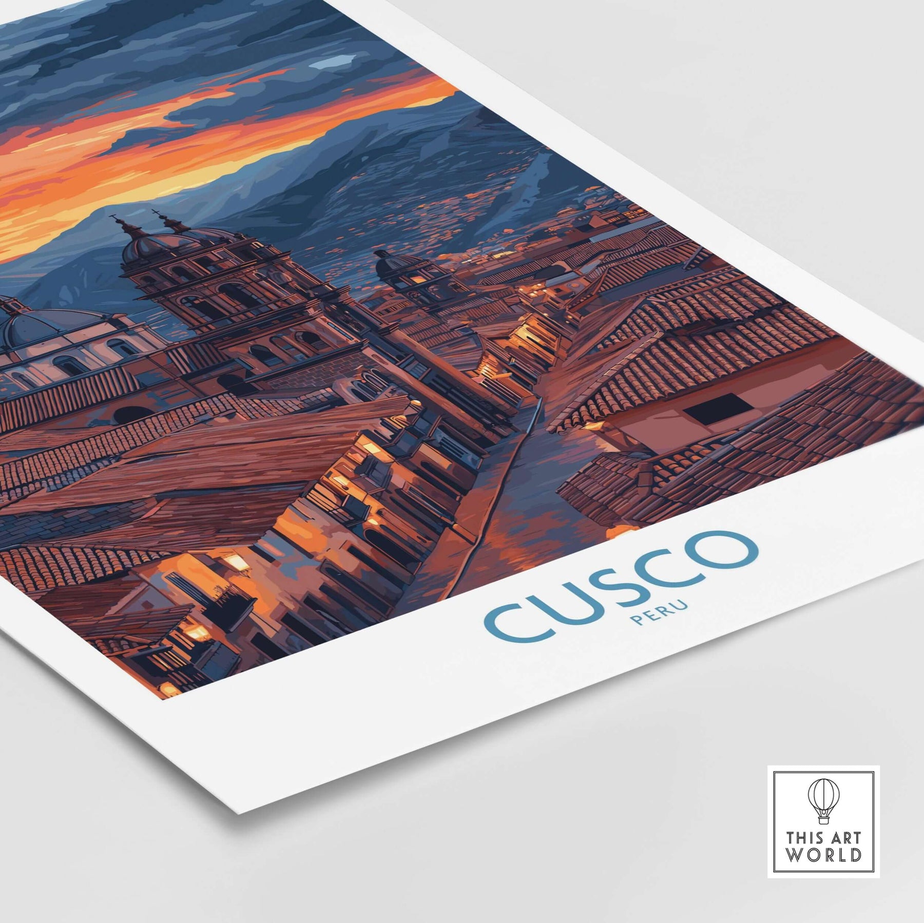 Cusco Peru Twilight Cityscape Art Print | Historic Rooftops Poster showcasing a vibrant sunset over historical rooftops.