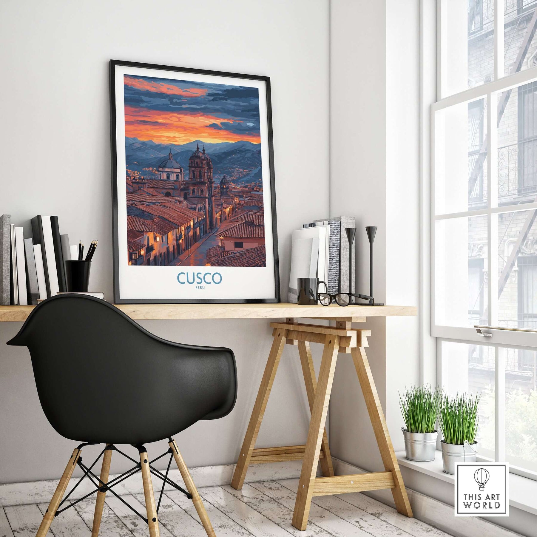 Cusco Peru Twilight Cityscape Art Print | Historic Rooftops Poster beautifully displayed in a minimalist workspace.