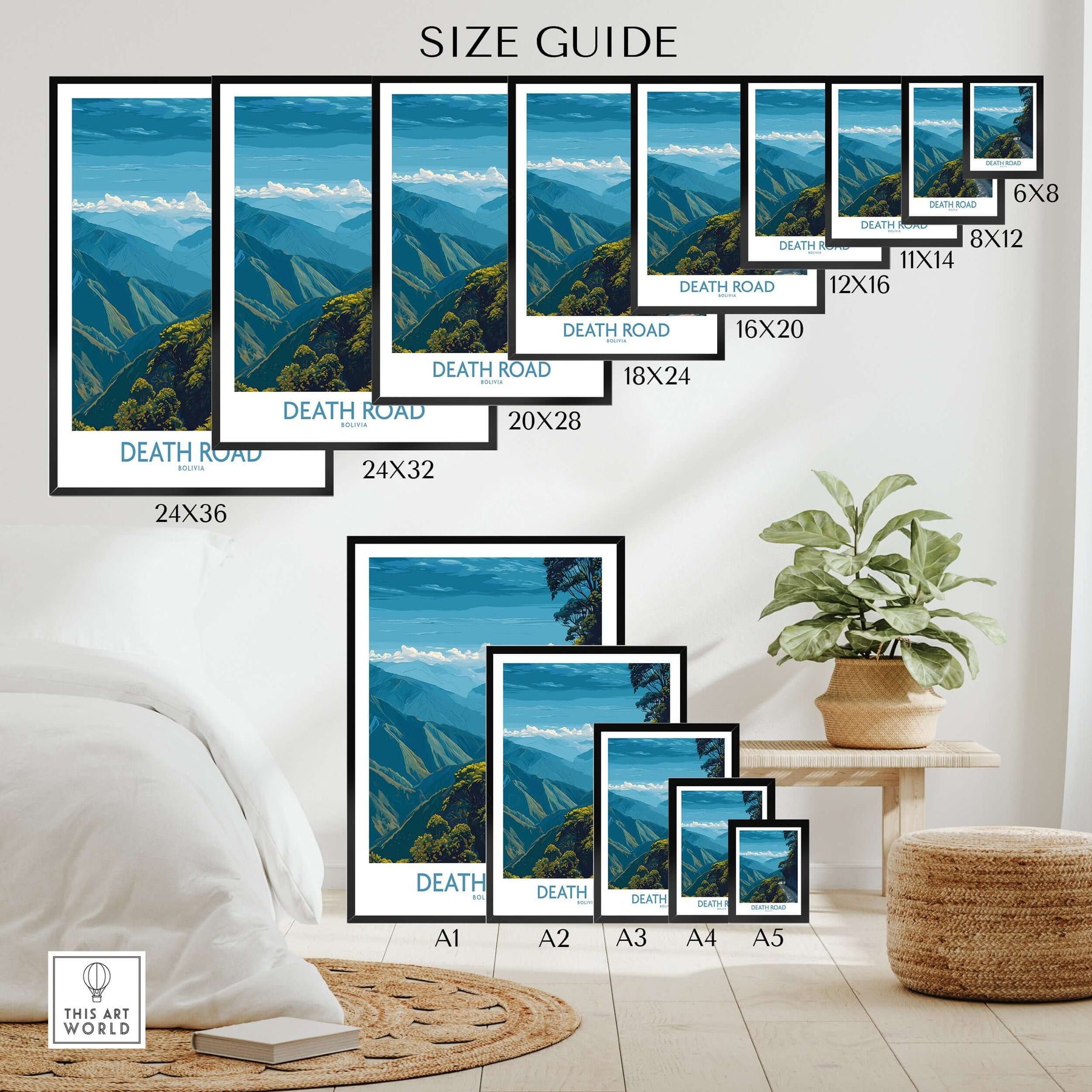 Death Road Bolivia Hiking Trail Art Print | Camino de la Mortes Poster size guide featuring various frame sizes.