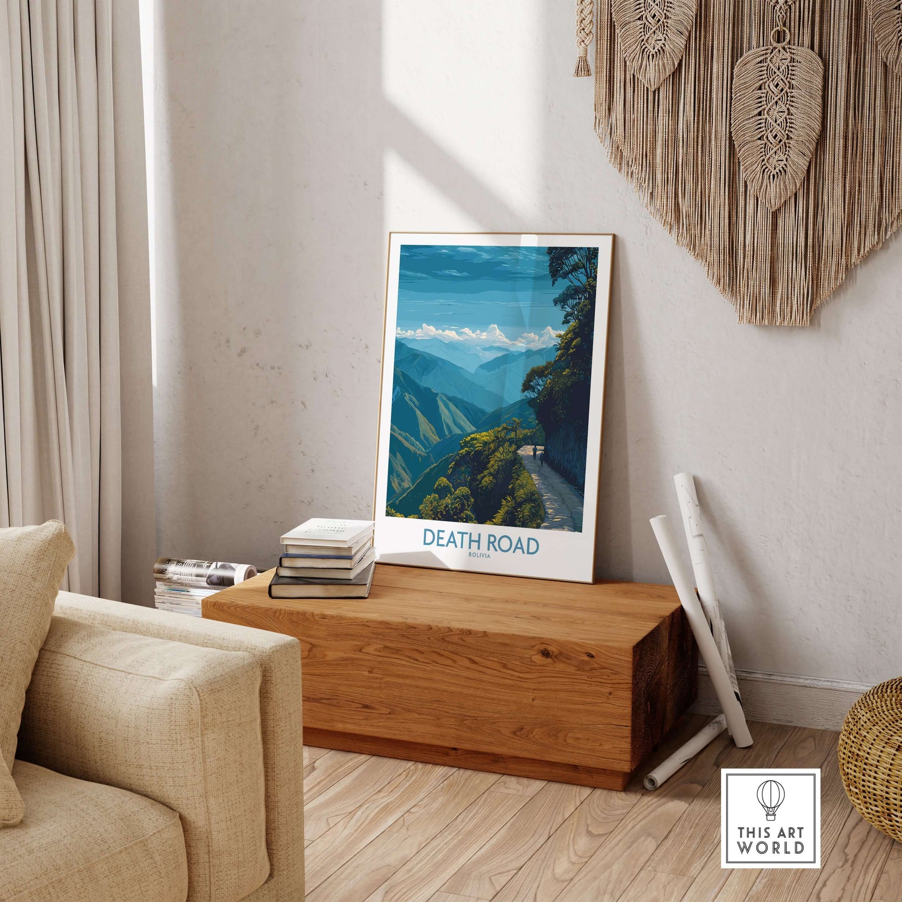Death Road Bolivia Hiking Trail Art Print | Camino de la Mortes Poster displayed in an artistic home setting.