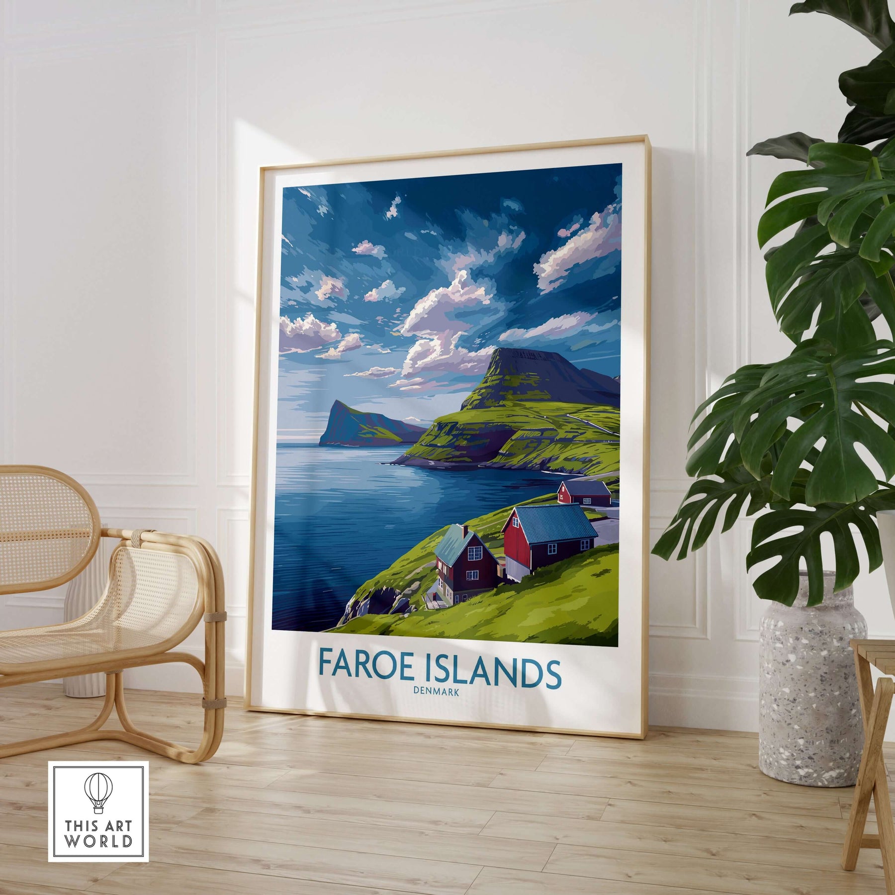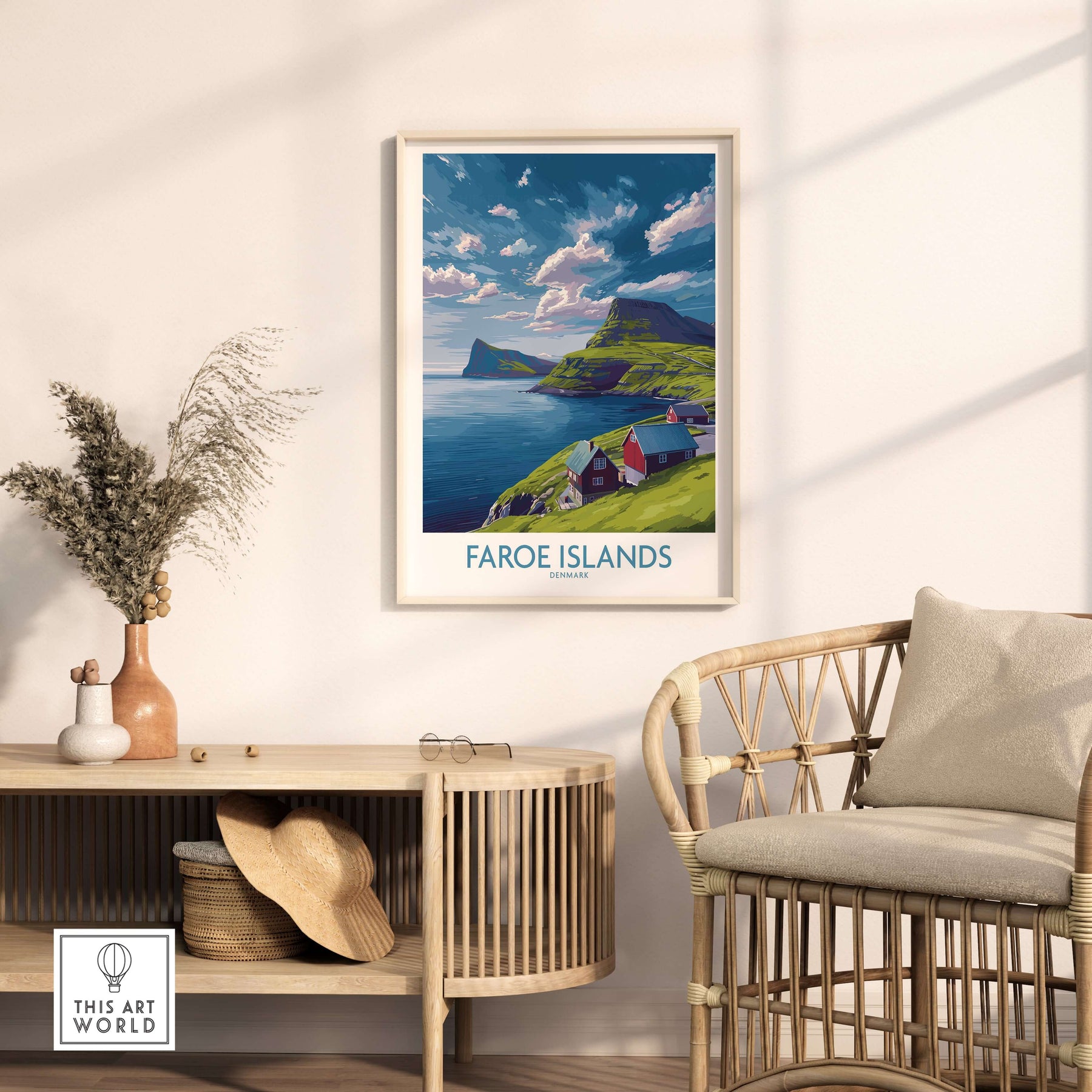 Faroe Islands Art Print | Denmark Poster showcasing stunning coastal scenery and vibrant colors in a cozy interior setting.