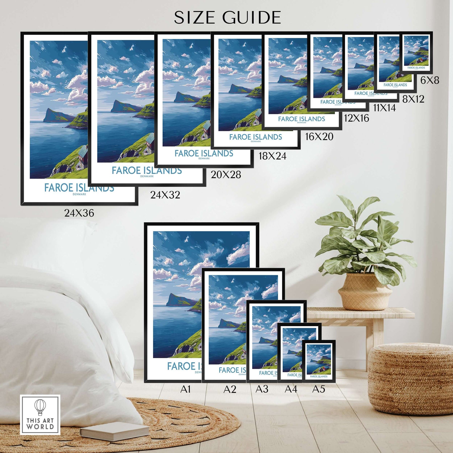 Size guide for Faroe Islands Art Print | Denmark Poster showcasing various frame sizes in a stylish interior setting.