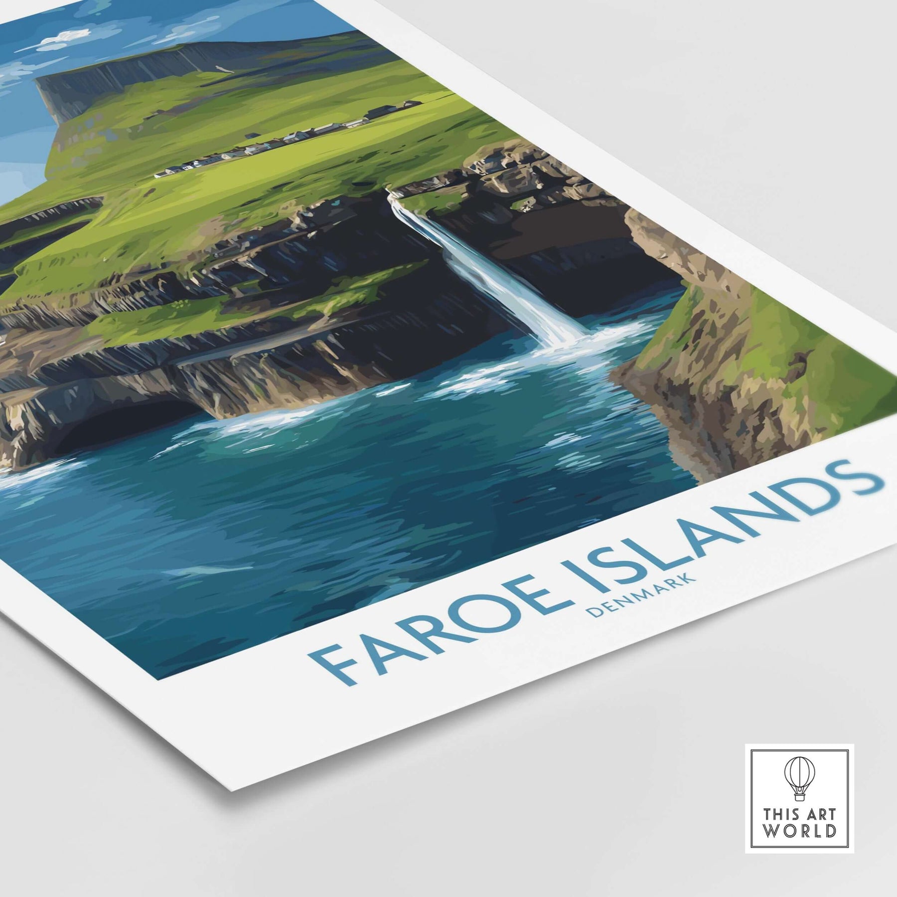 Faroe Islands Waterfall Art Print | Denmark Poster featuring breathtaking landscape and cascading waterfall.