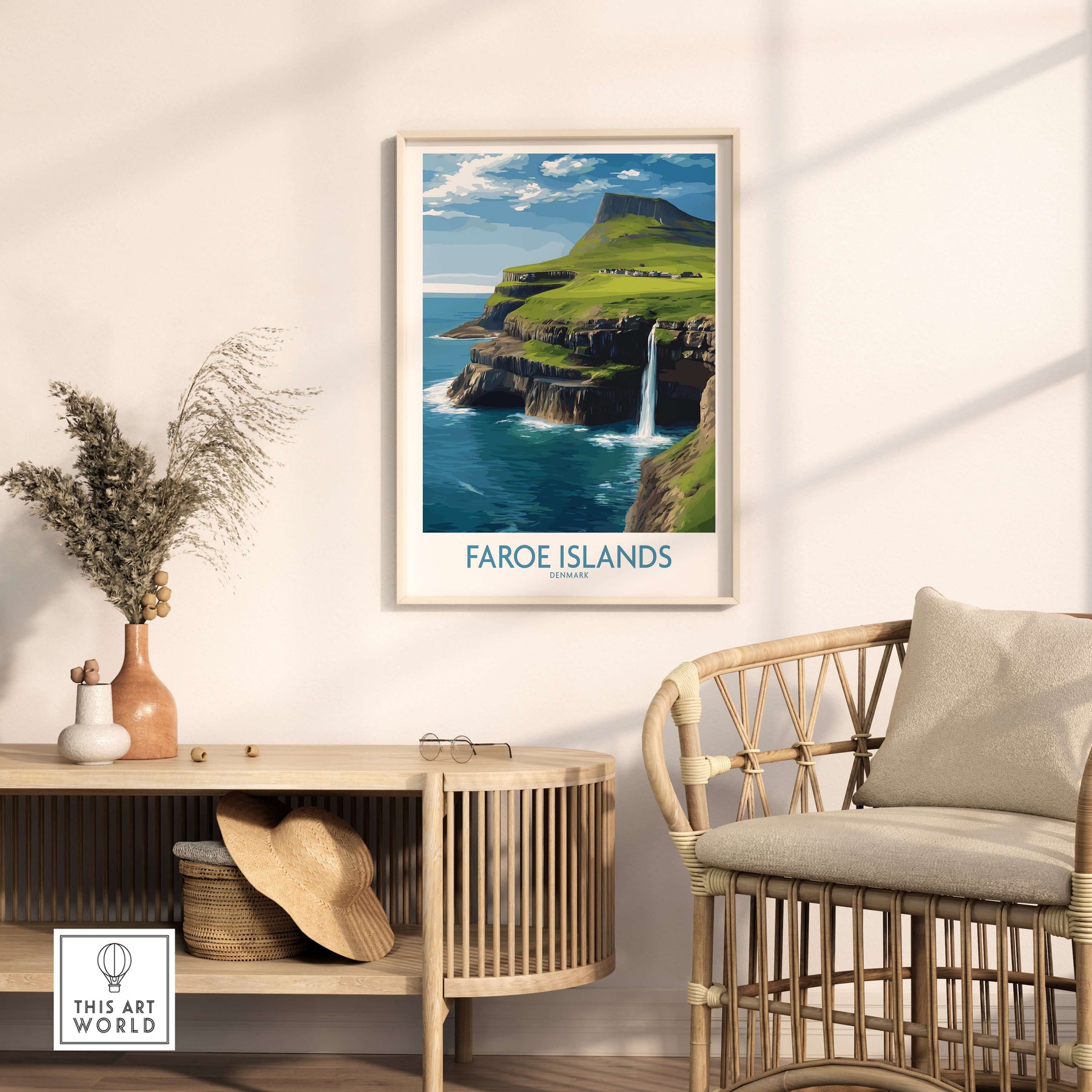 Faroe Islands Waterfall Art Print | Denmark Poster displayed in a modern interior setting with stylish decor.