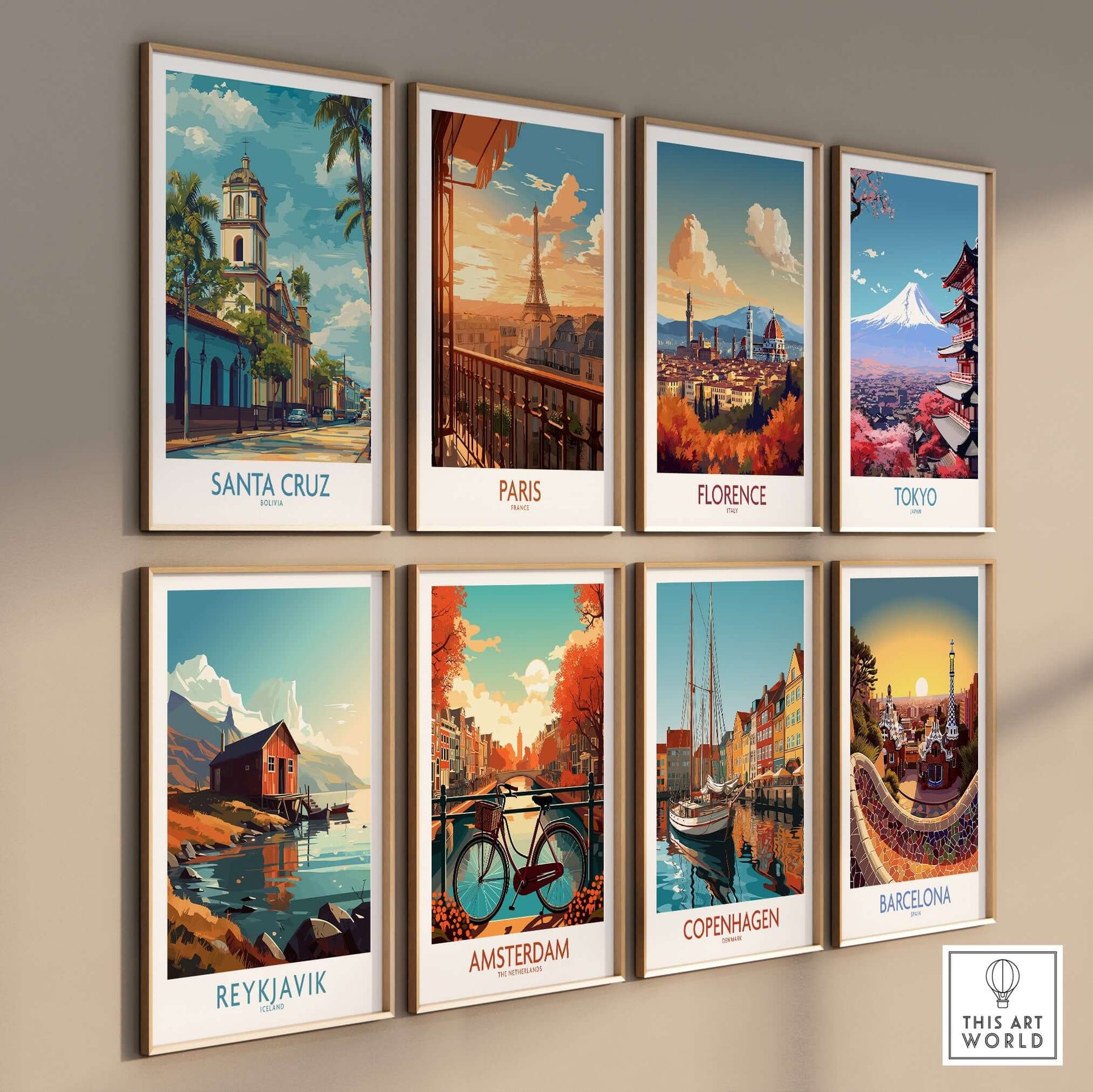 Santa Cruz Bolivia Tropical Street Art Print | Historic Church Poster among framed travel posters on a stylish shelf.