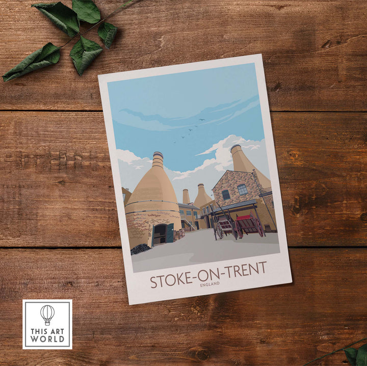 Stoke on Trent vintage travel poster print showcasing iconic pottery industry with blue skies.