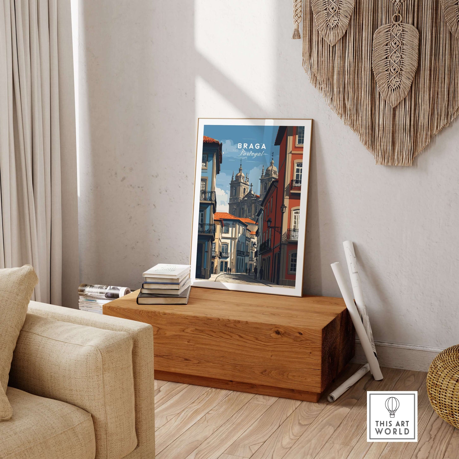 Braga Historic Centre Print | Portuguese Urban Wall Art displayed in a cozy living room setting.